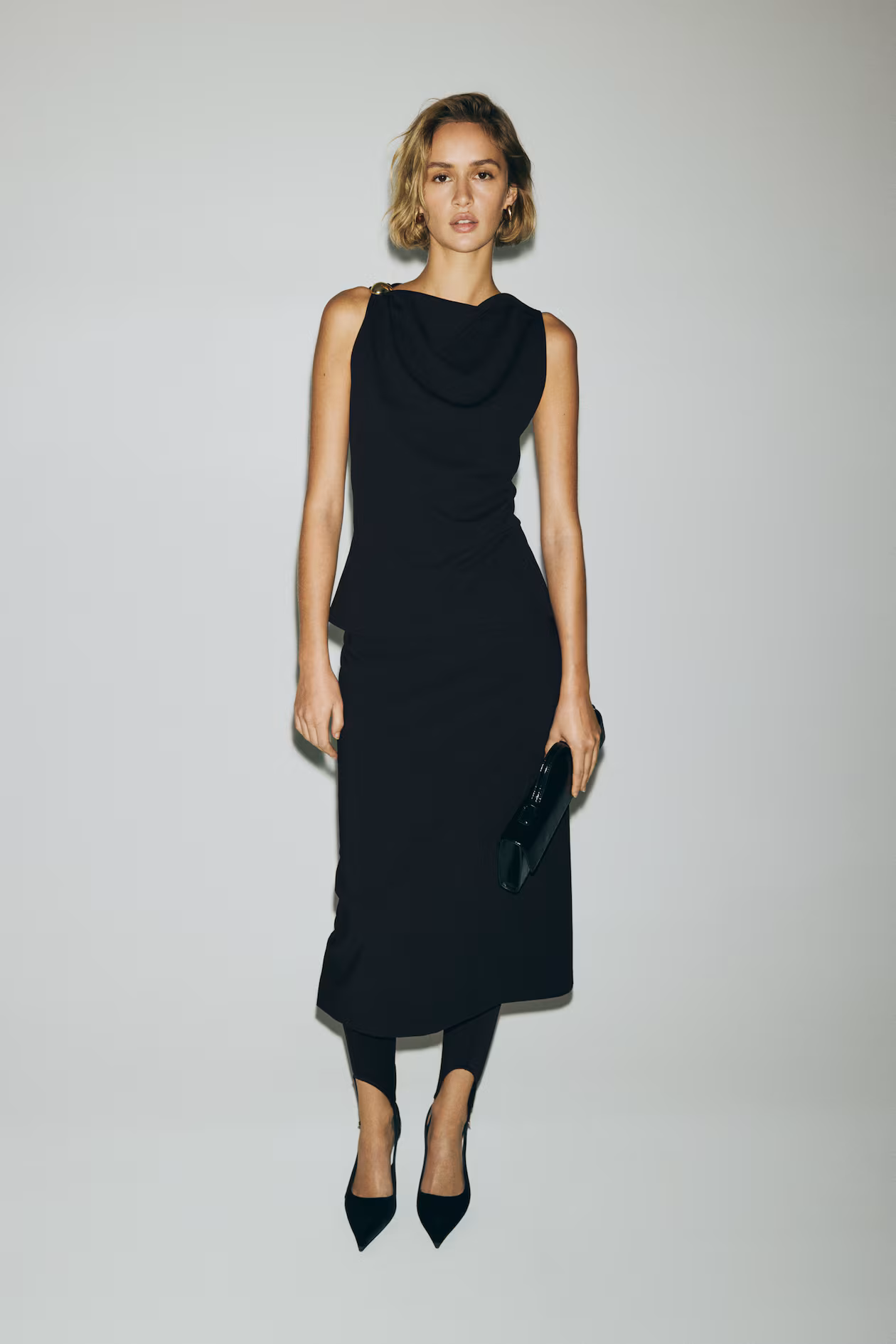 Sleeveless, cowl-neck top in crêpe jersey with a metal detail on one shoulder.