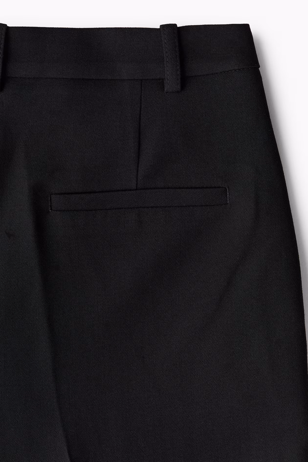 Loose-fit pants in woven fabric. High waist, zip fly with concealed hook-and-eye fastening, diagonal side pockets, and mock welt back pockets. Straight legs with stitched creases at front and pressed creases at back.