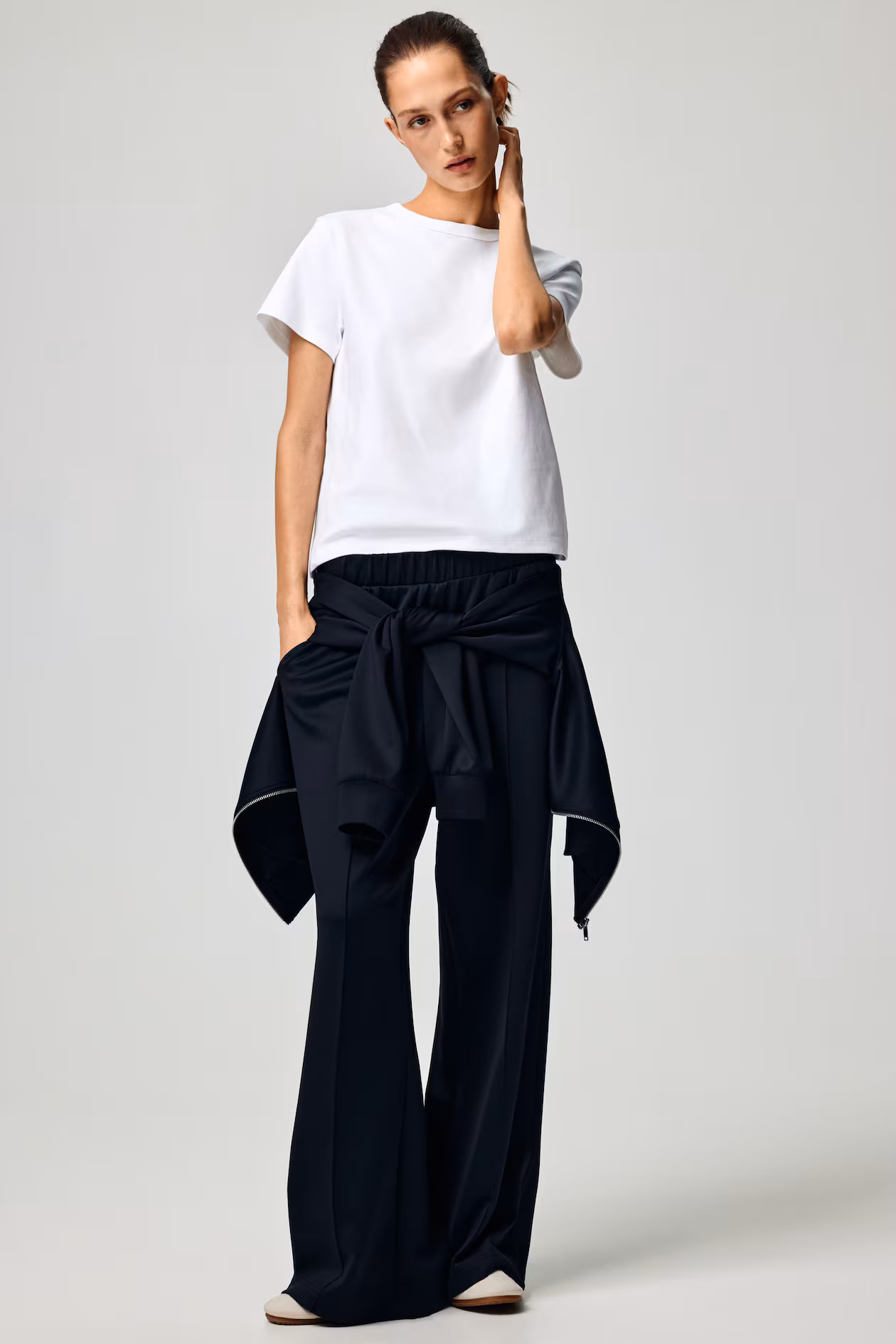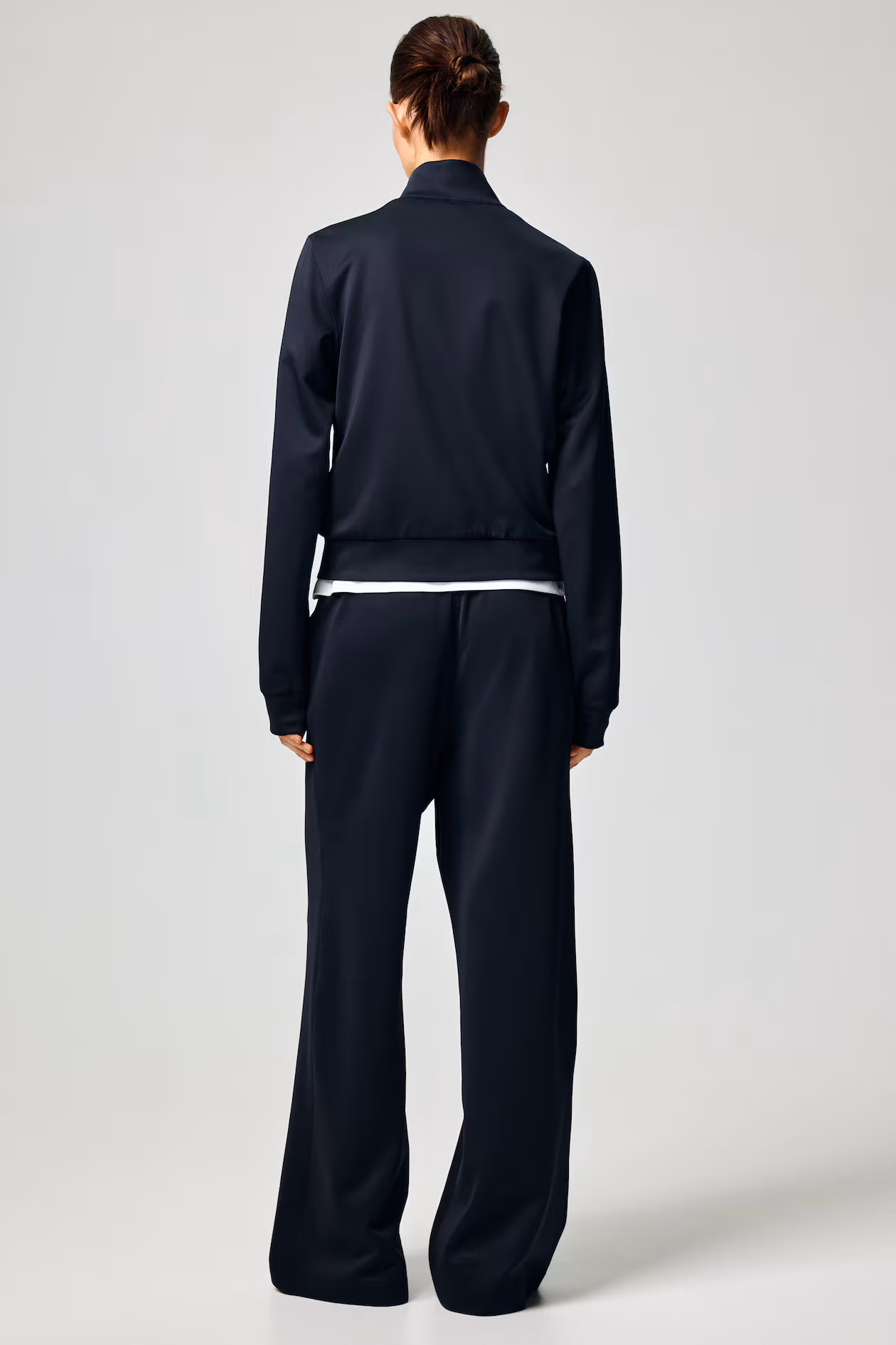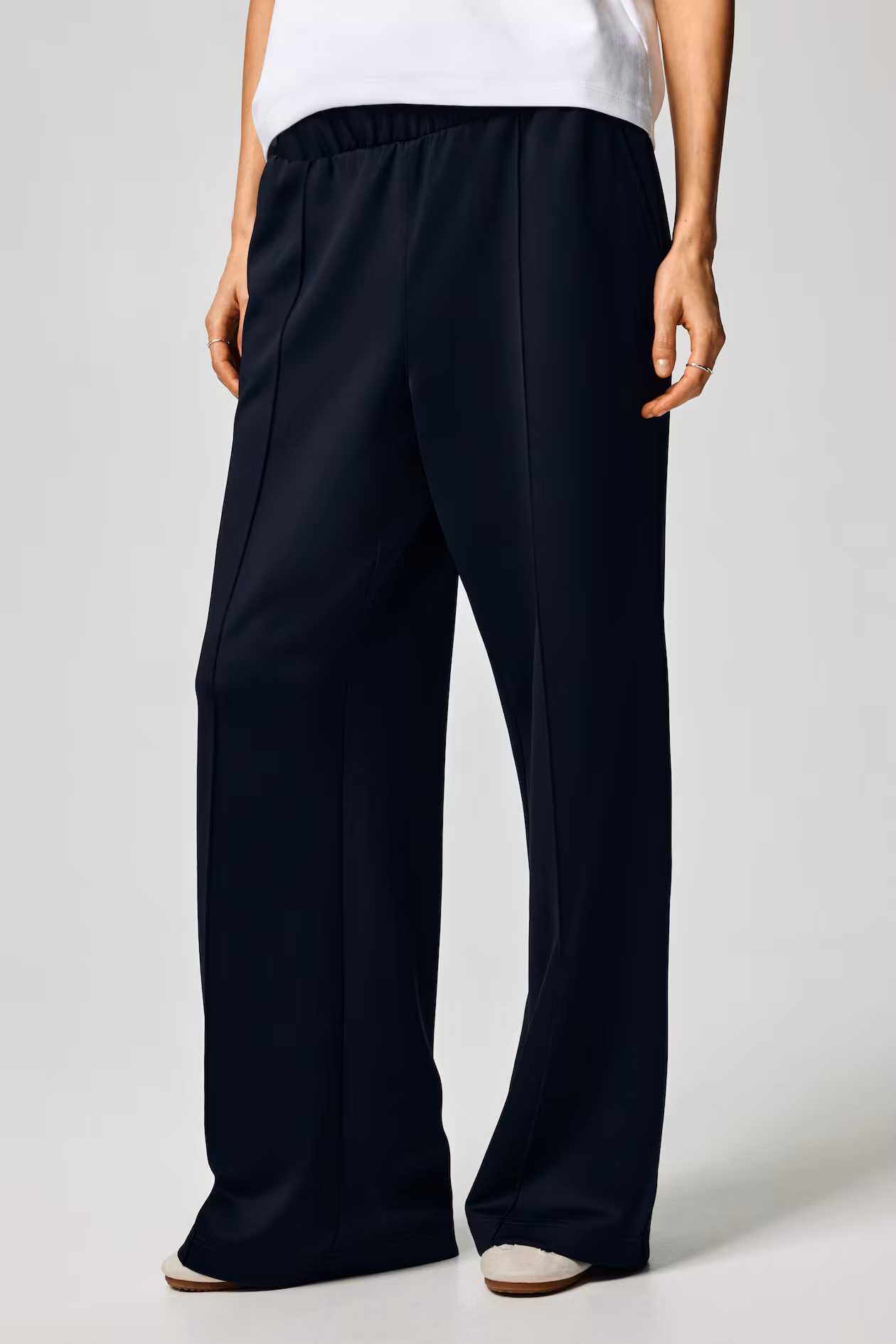 Loose-fit pants in thick jersey with a slight sheen. Covered elastic at waistband, diagonal side pockets, and stitched creases at front. Straight legs.