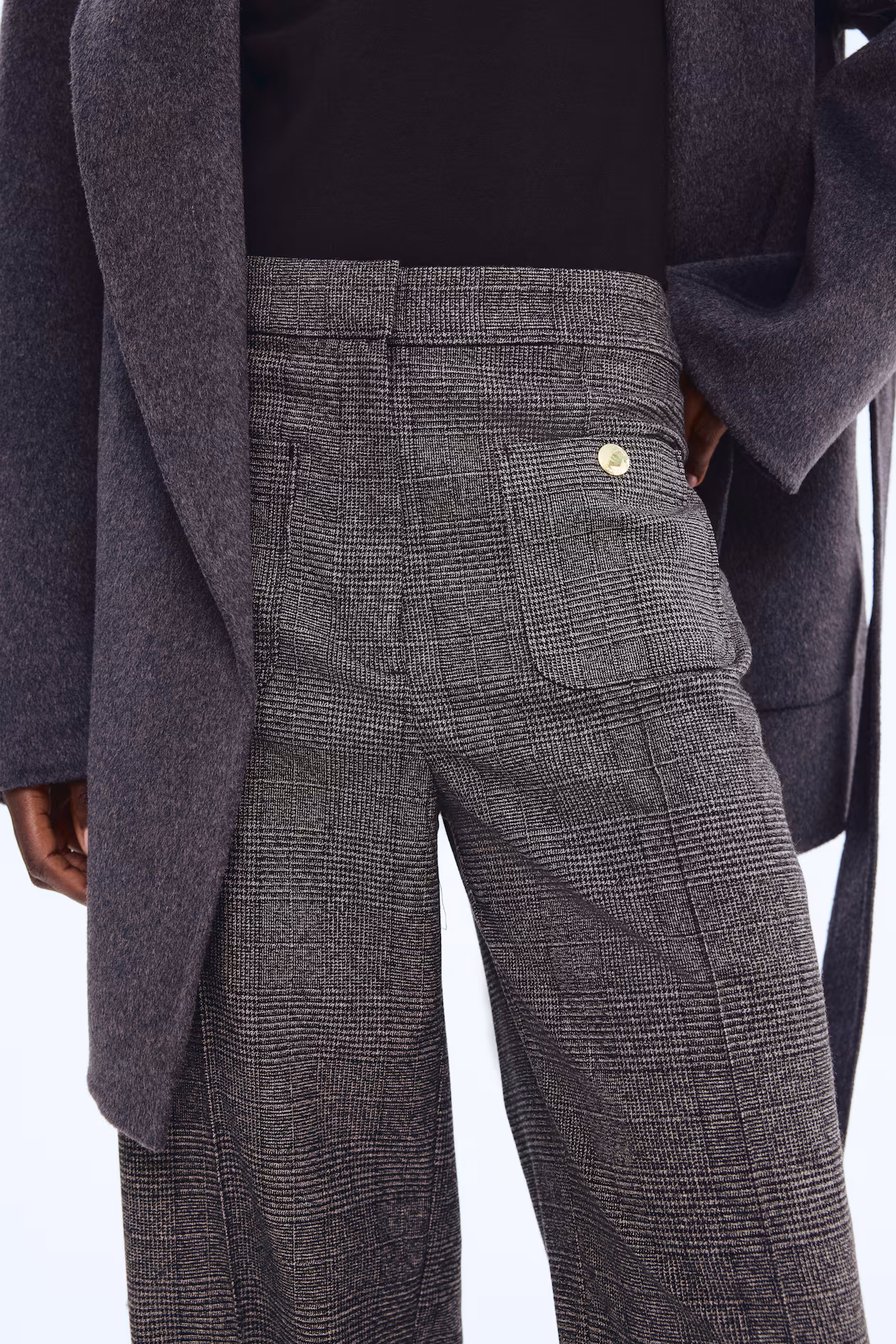 Pants in woven fabric. High waist, zip fly with concealed hook-and-bar fastener, and patch front pockets with a decorative button. Straight legs with stitched creases at front and back.