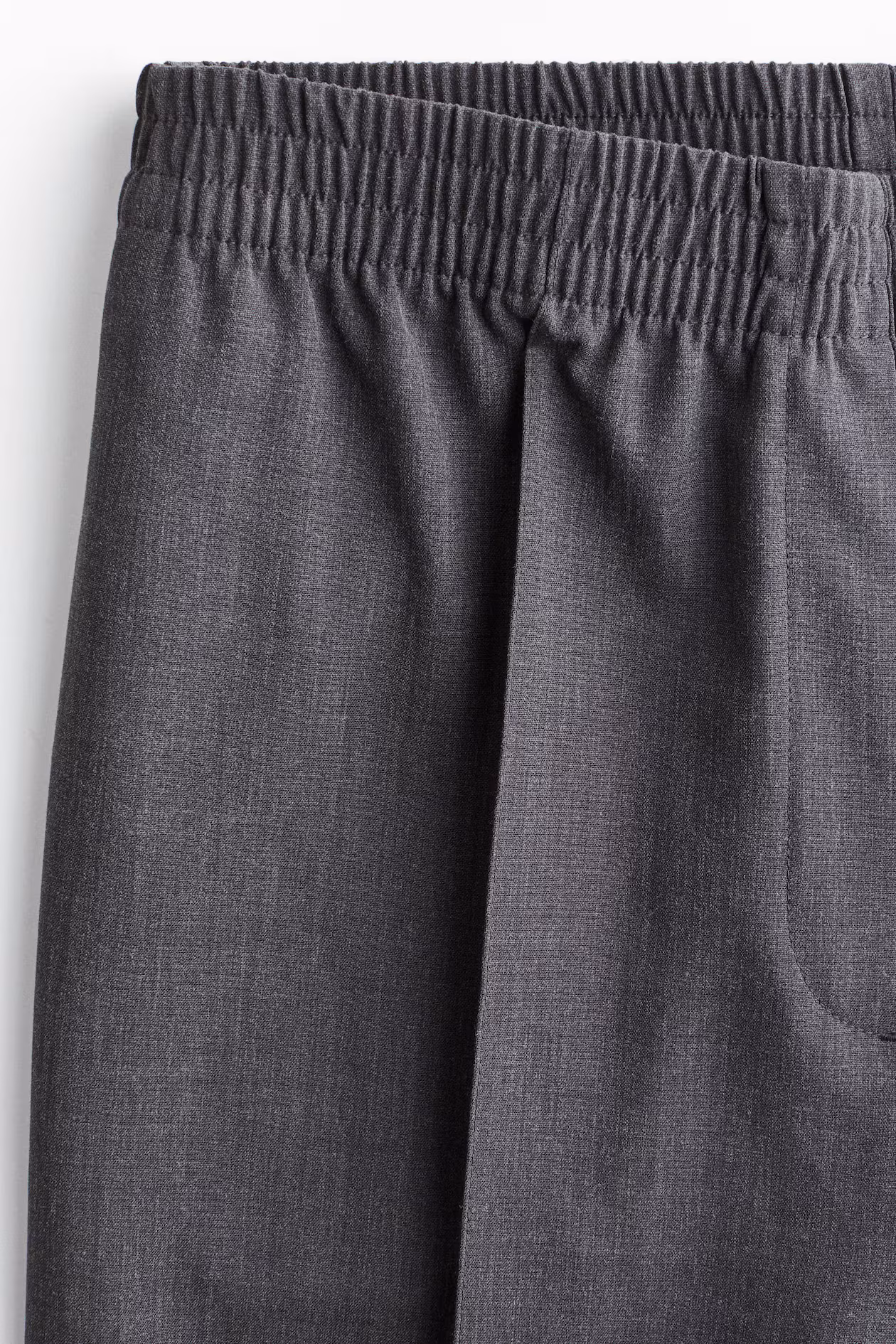 Loose-fit pants in woven fabric with discreet side pockets. High waist, smocked elastic at waistband, and a mock fly. Wide legs with stitched creases at front and pressed creases at back.