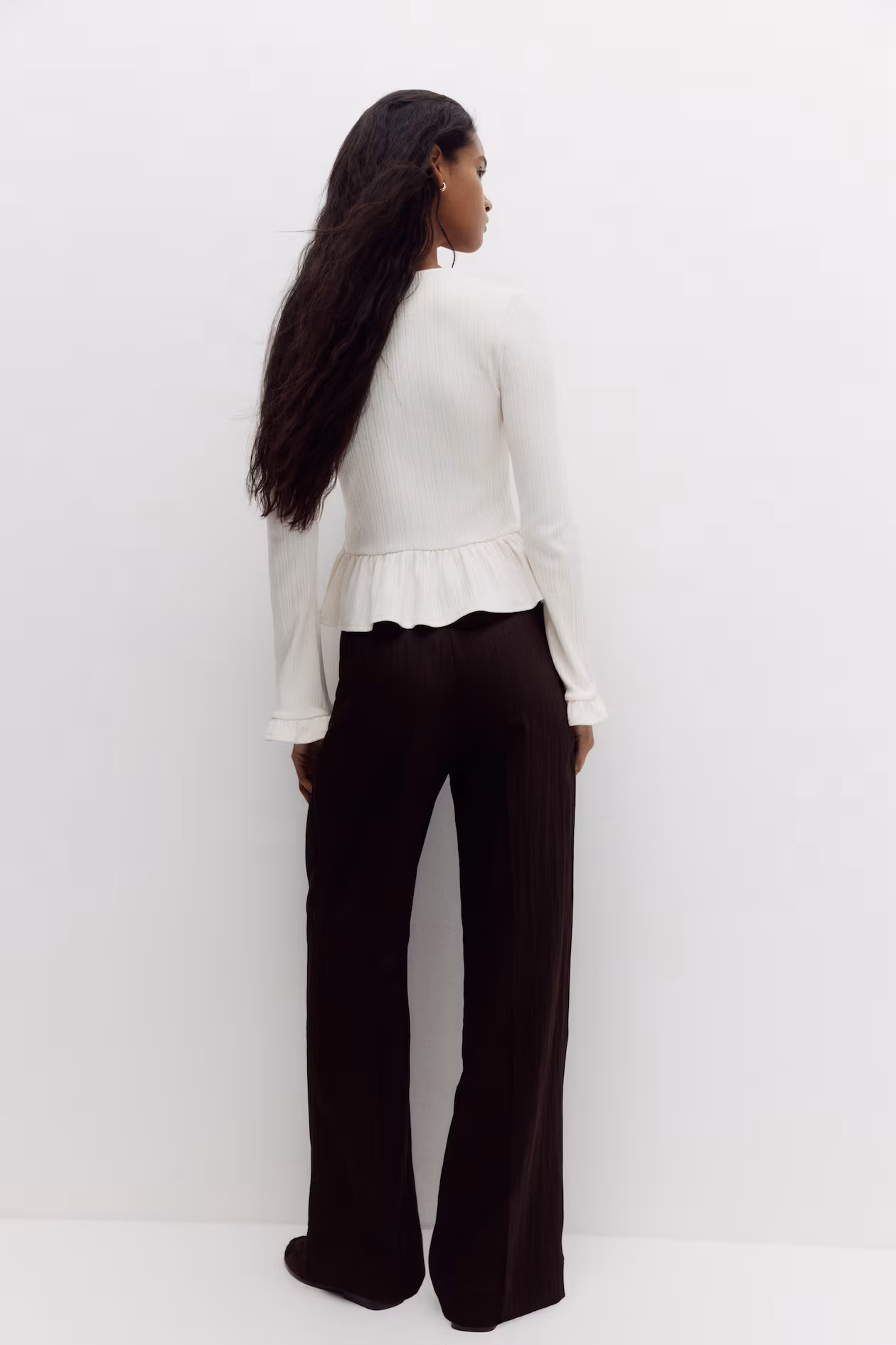 Dress pants in crinkled woven fabric. Zip fly with concealed hook-and-eye fastener, diagonal side pockets, and welt back pockets. Wide legs with pleats at front and creases at front and back.