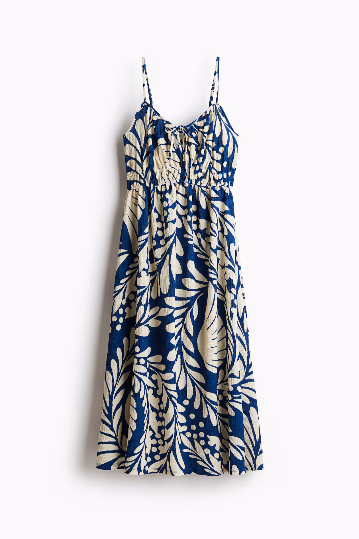 Calf-length dress in crinkled jersey. Adjustable, extra-narrow shoulder straps, sweetheart neckline, keyhole opening at center bust with narrow ties, and narrow elastic below bust. Gently flared skirt.