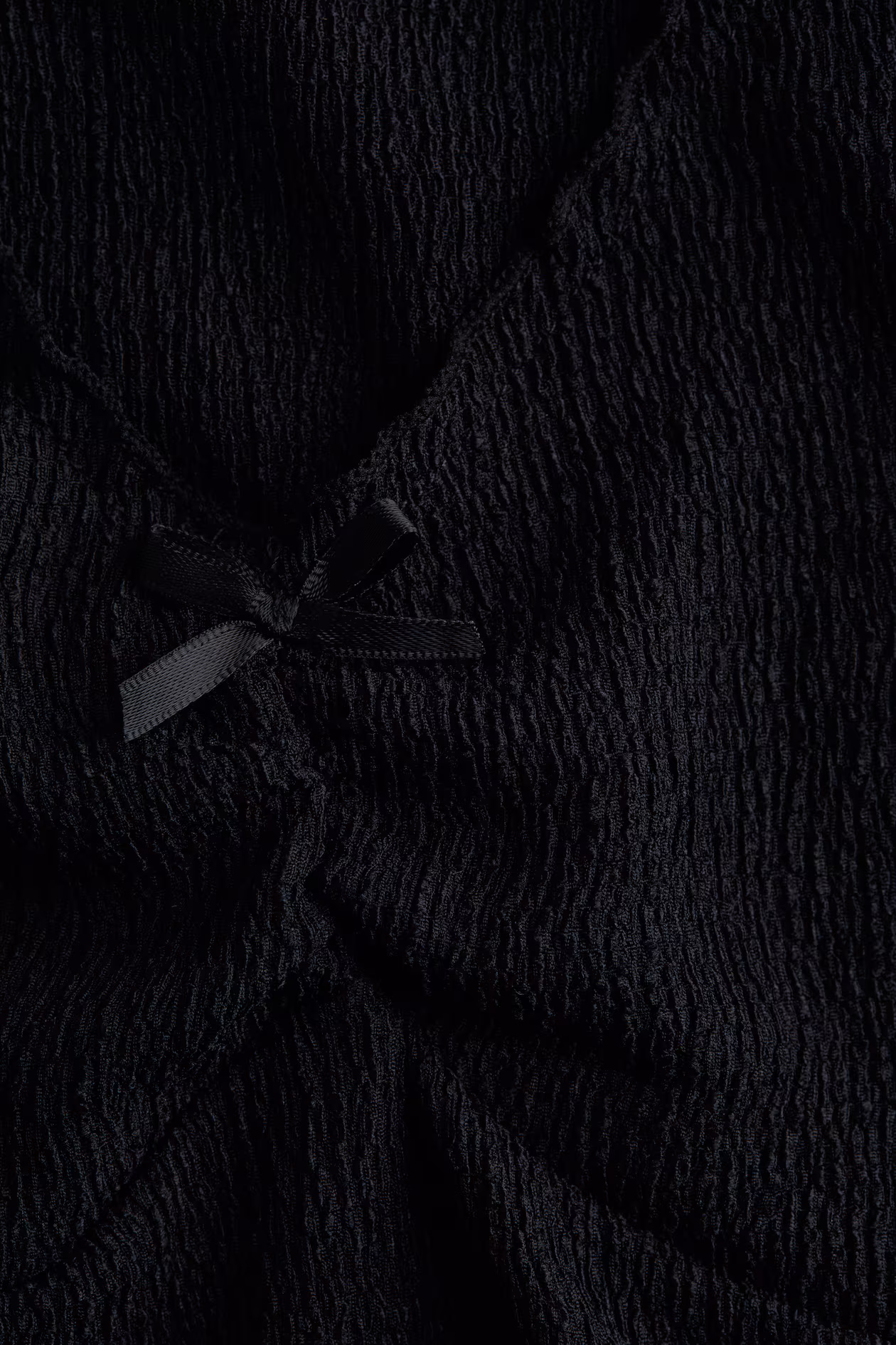 Short, fitted sleeveless top in soft crinkled jersey with a V-neck and ruffle trim. Gathered seam and a decorative satin bow at center bust.