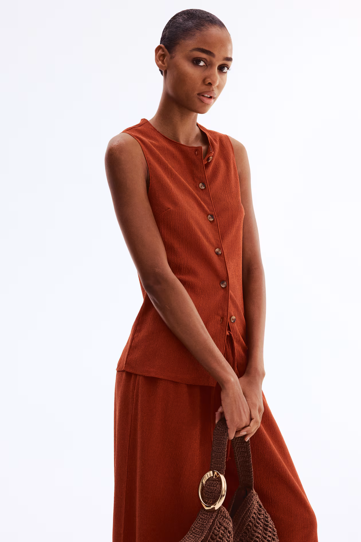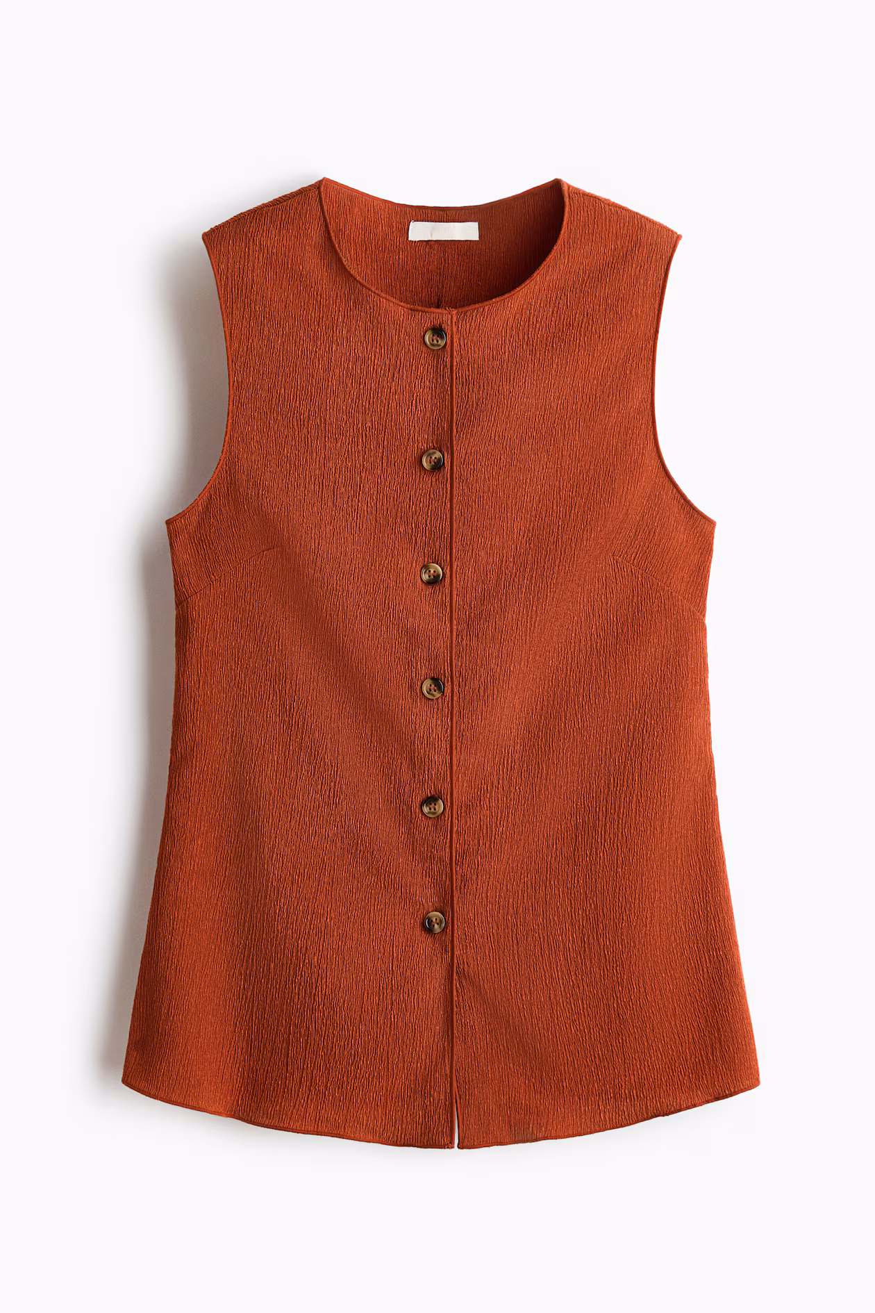 Vest in crinkled jersey. Round neckline and buttons at front.