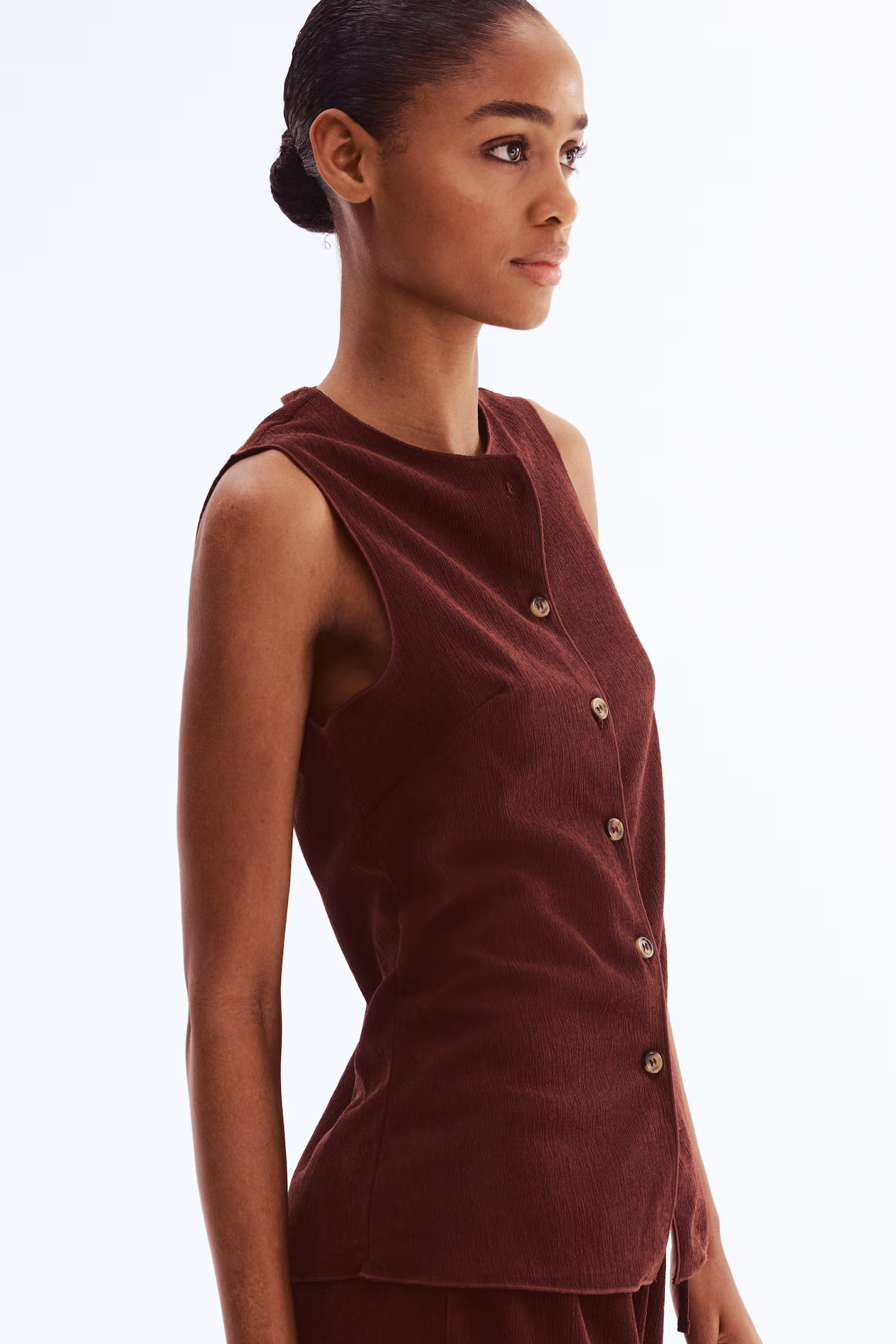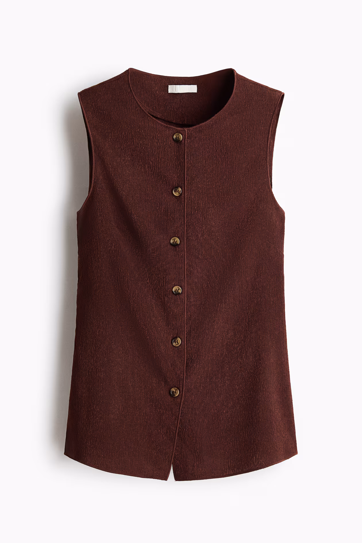 Vest in crinkled jersey. Round neckline and buttons at front.