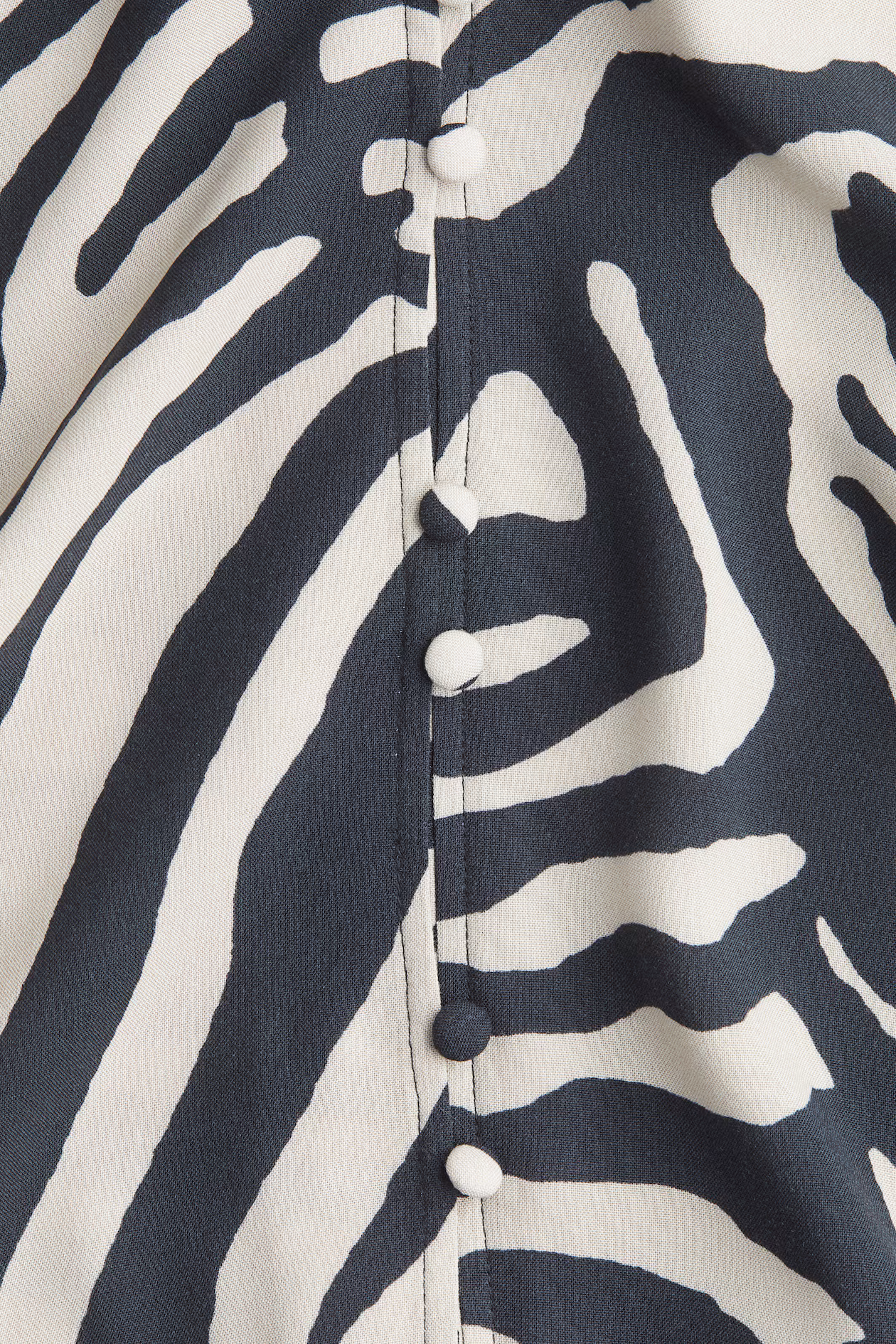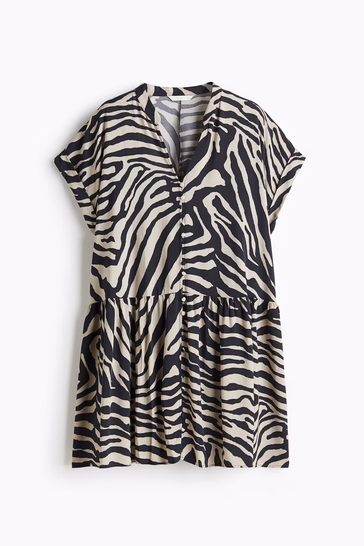 Short, loose-fit tunic dress in woven, crinkled fabric. Band collar, V-shaped opening at front, and covered buttons at front. Short sleeves with foldover cuffs. Gathered seam at hips for added volume. Unlined.