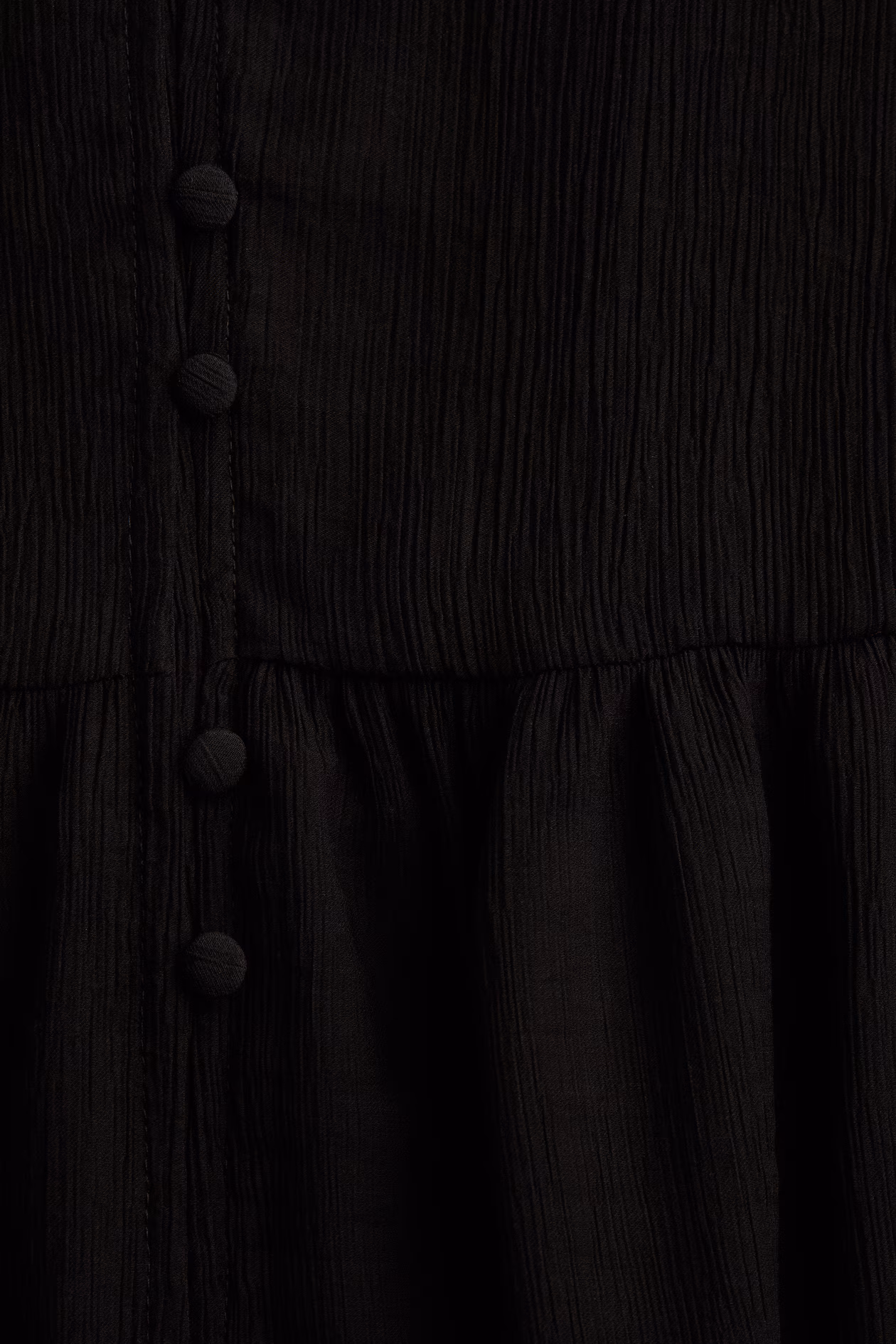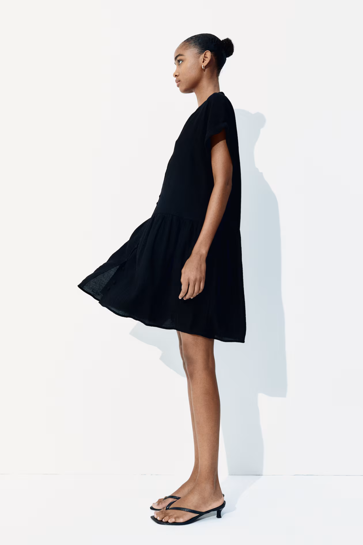 Short, loose-fit tunic dress in woven, crinkled fabric. Band collar, V-shaped opening at front, and covered buttons at front. Short sleeves with foldover cuffs. Gathered seam at hips for added volume. Unlined.