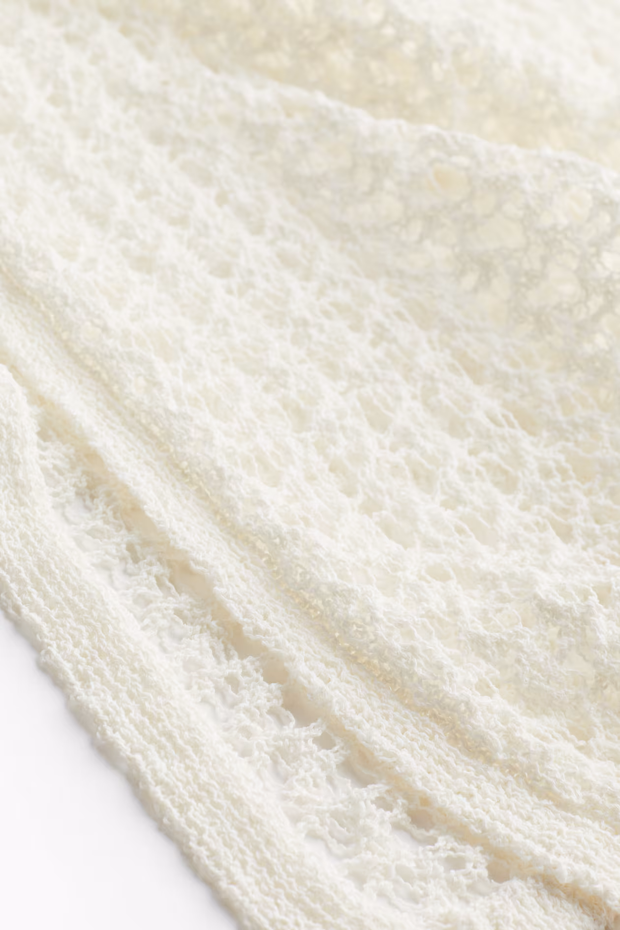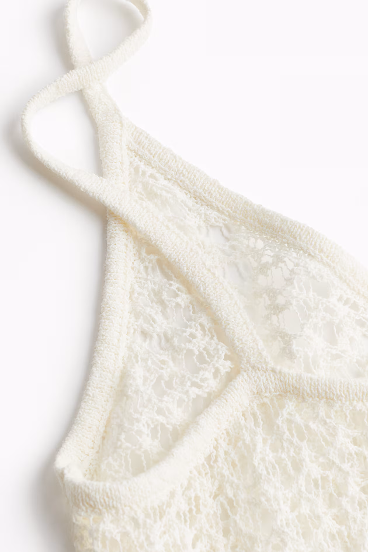 Calf-length beach dress in a loose, crochet-look knit. Narrow shoulder straps, low-cut V-neck, and straight hem with a high slit at one side. Unlined.