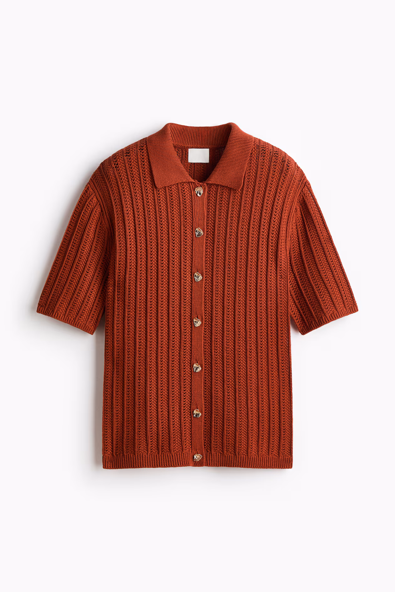Relaxed-fit, crochet-look knit cardigan in soft cotton. Collar, textured metal buttons at front, dropped shoulders, and elbow-length sleeves. Ribbing at cuffs and hem.