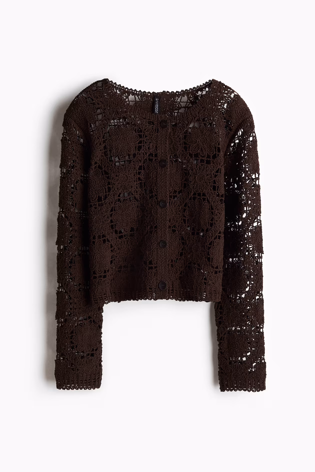 Short cardigan in a crochet-look knit. Round neckline, buttons at front and, long sleeves. Straight hem.