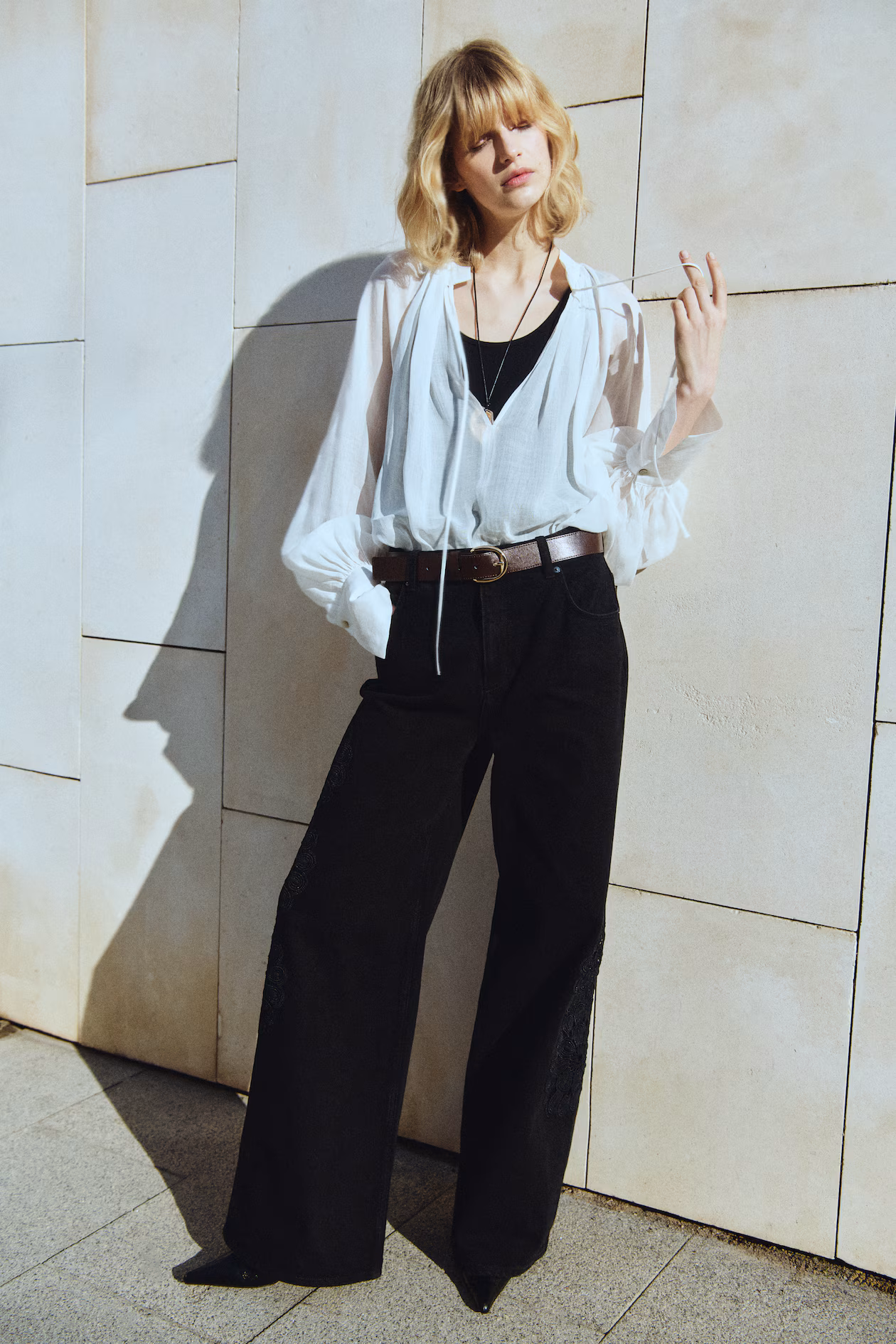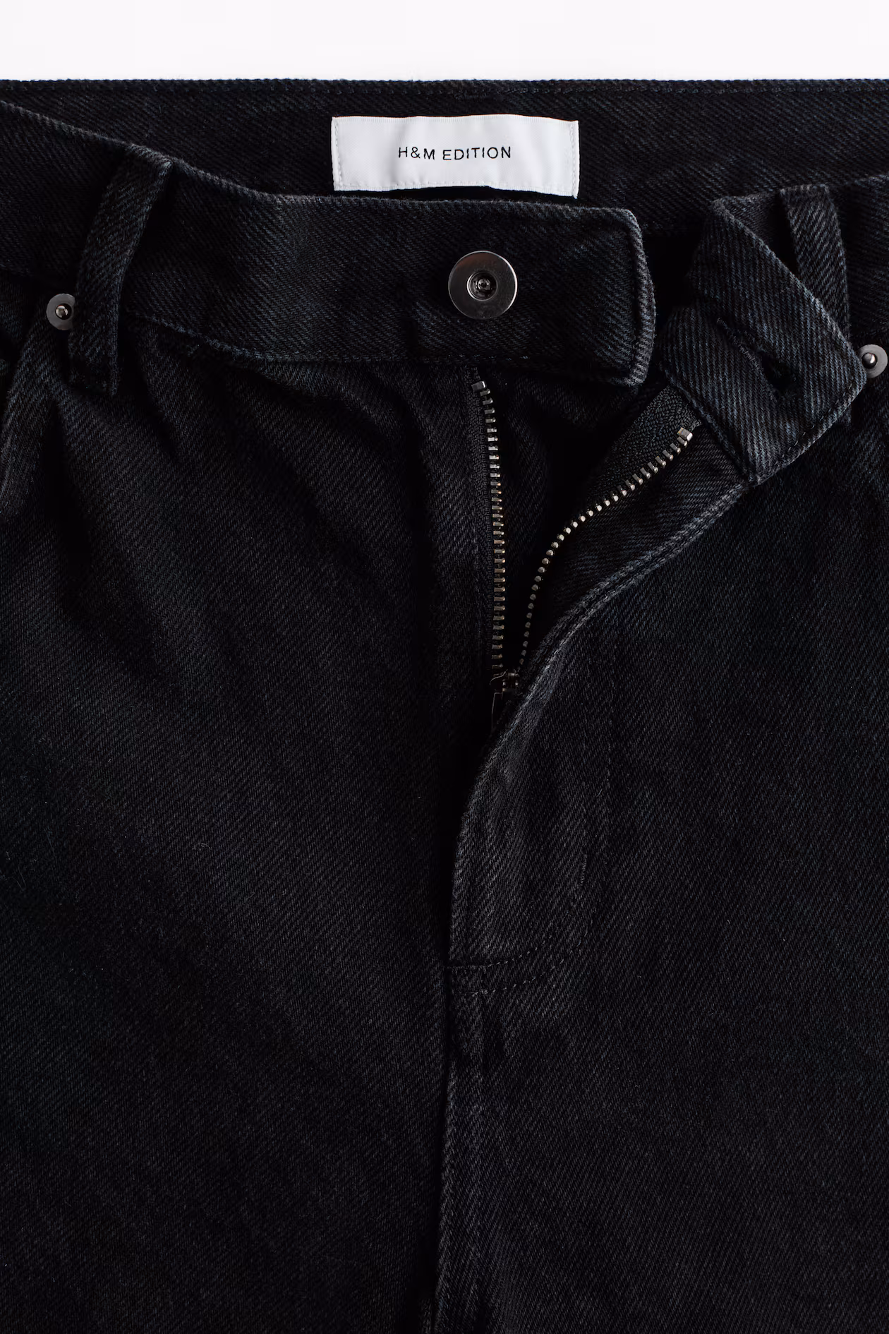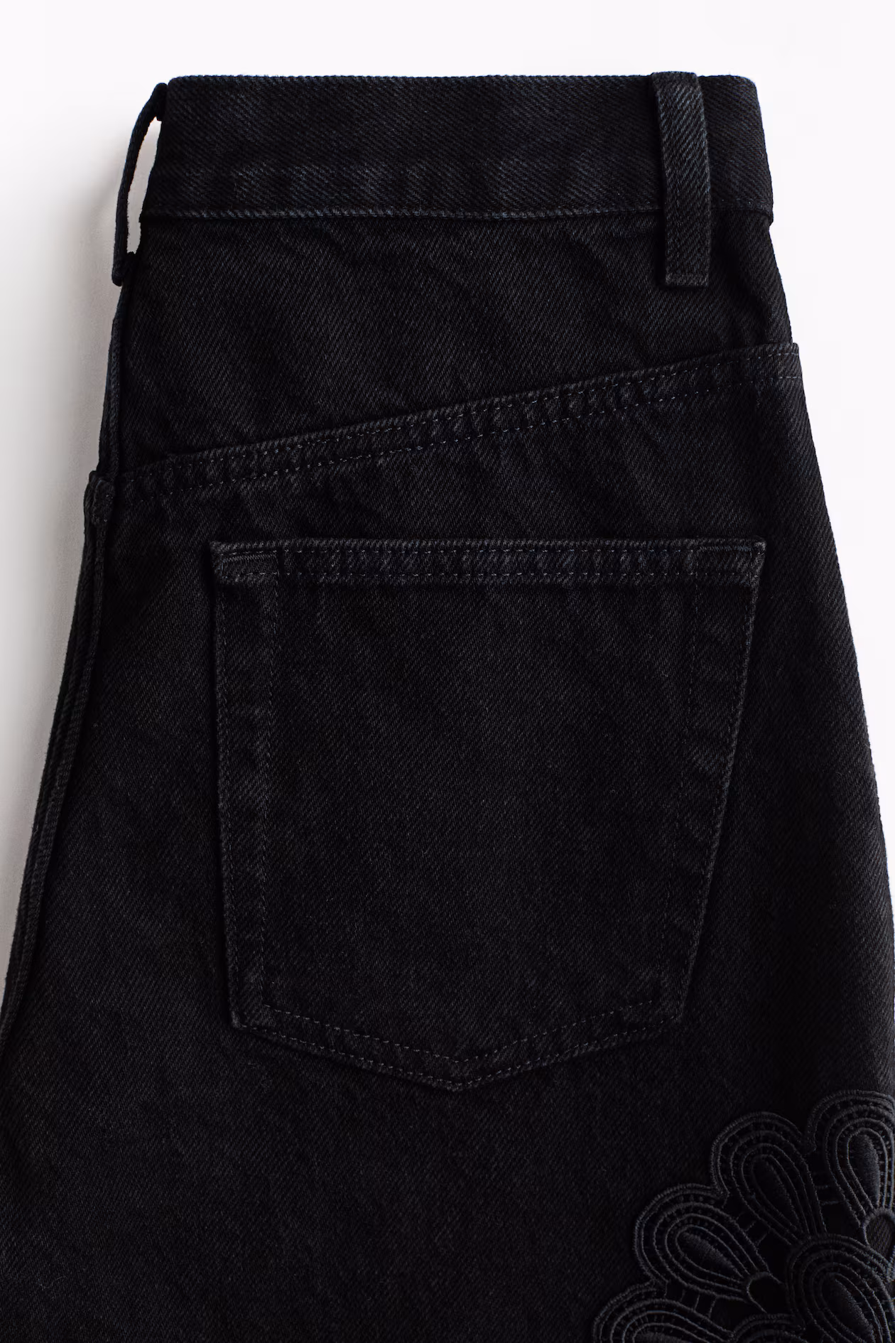 5-pocket jeans in rigid cotton denim that feels firm at first, softening and relaxing with wear. Regular fit from waist to hip and wide cut from thigh to hem. High waist, zip fly with button, and tone-on-tone crochet-look details at sides. Wide, longer legs, designed to fall over foot with a stacking effect.