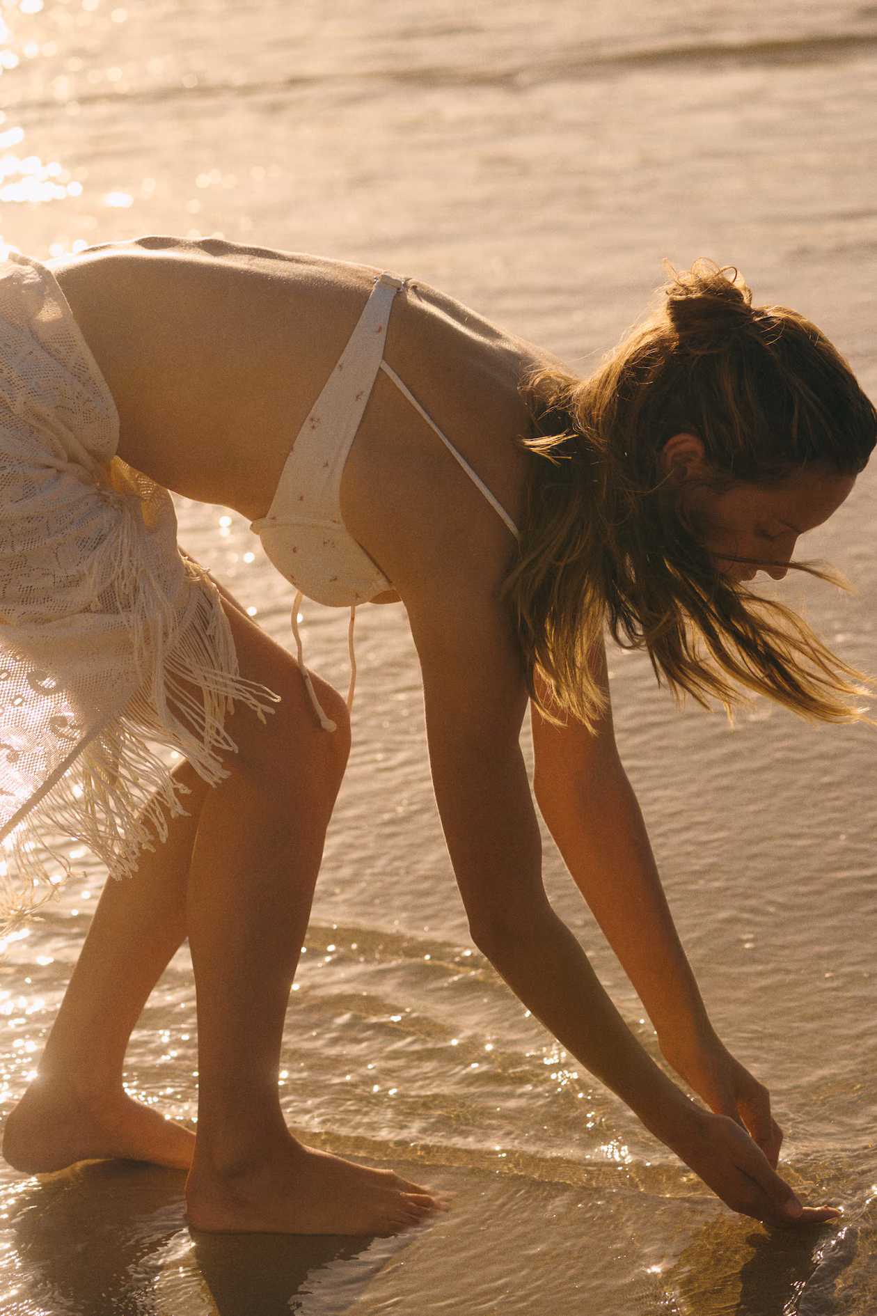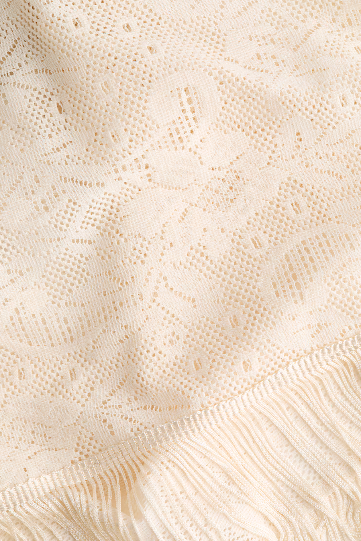 Knee-length, triangular sarong in crochet-look woven fabric. Fringe at hem.