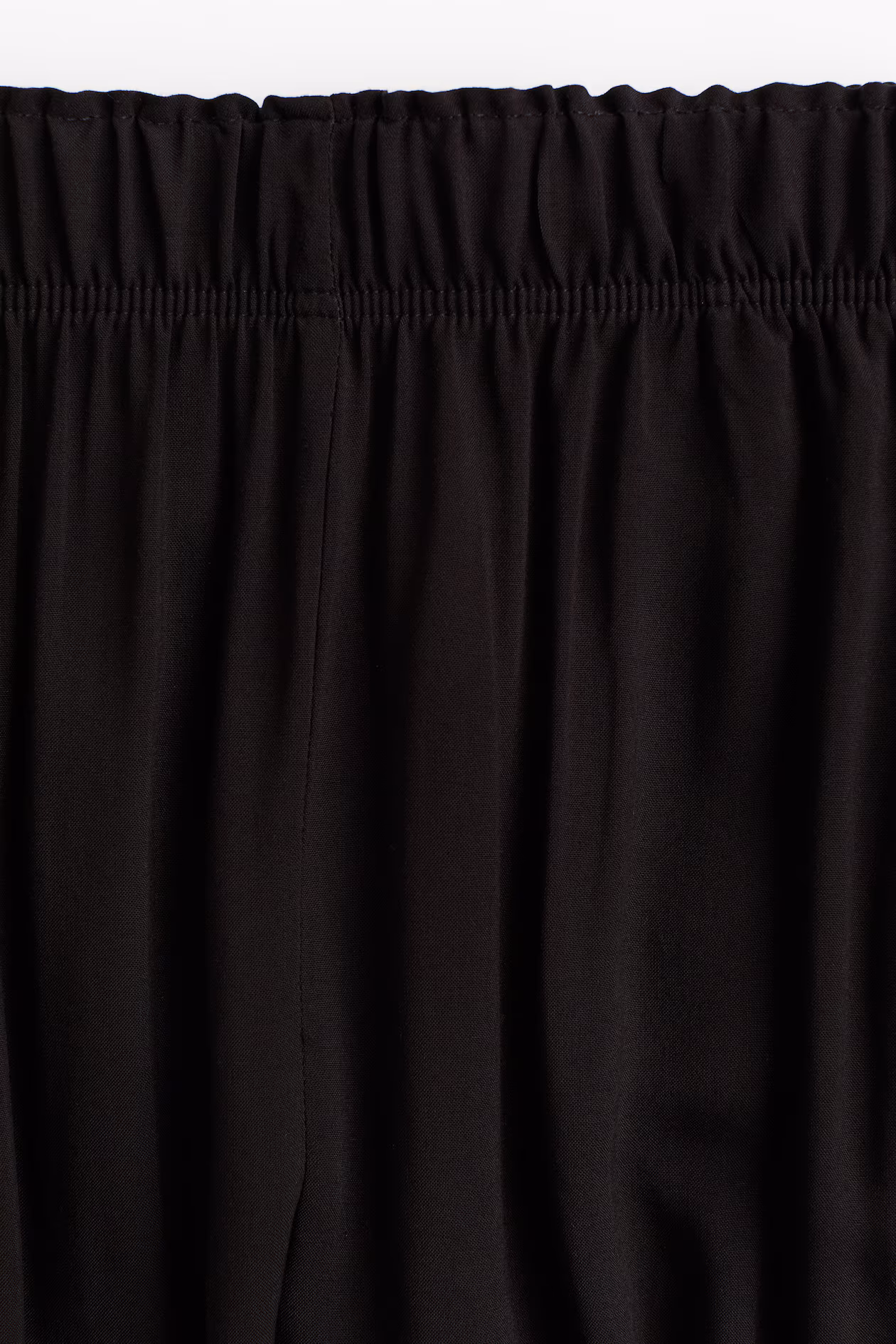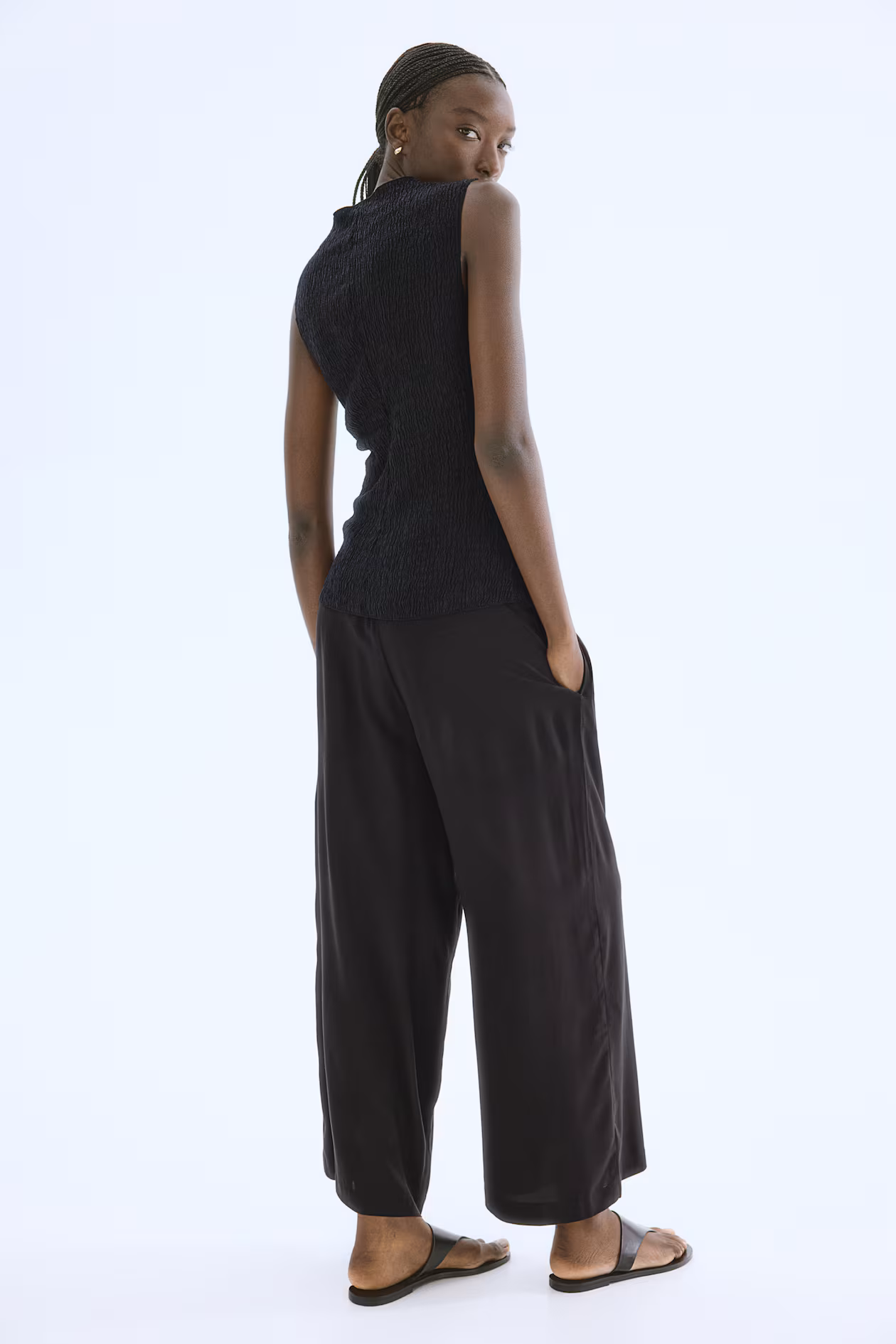 Ankle-length pants in softly draped woven viscose. High waist, covered elastic at waistband, and discreet side-seam pockets. Straight, wide legs.