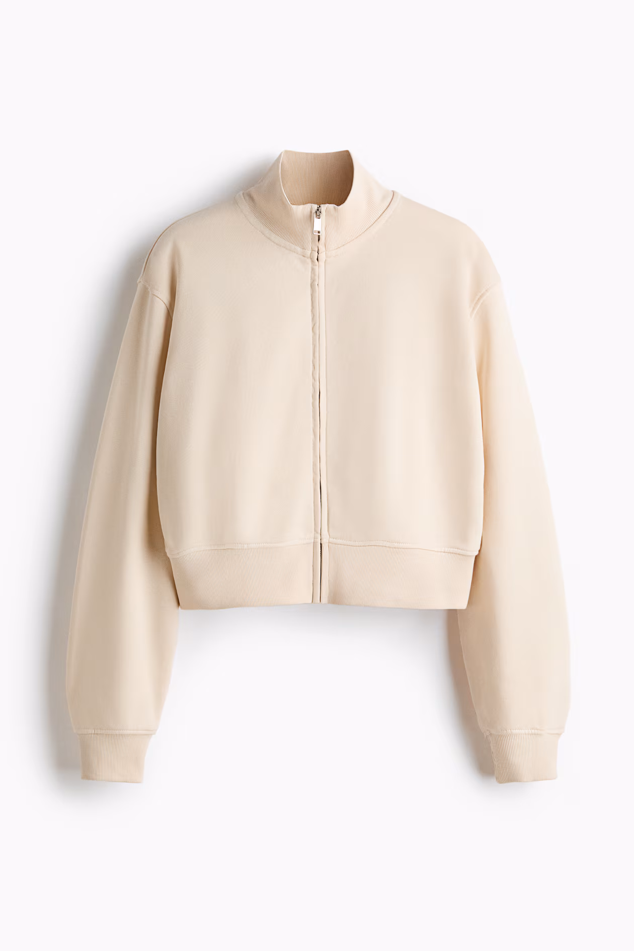 Fitted, cropped sweatshirt jacket in lightweight fabric. Stand-up collar, concealed zipper at front, and dropped shoulders. Ribbing at collar, cuffs, and hem.