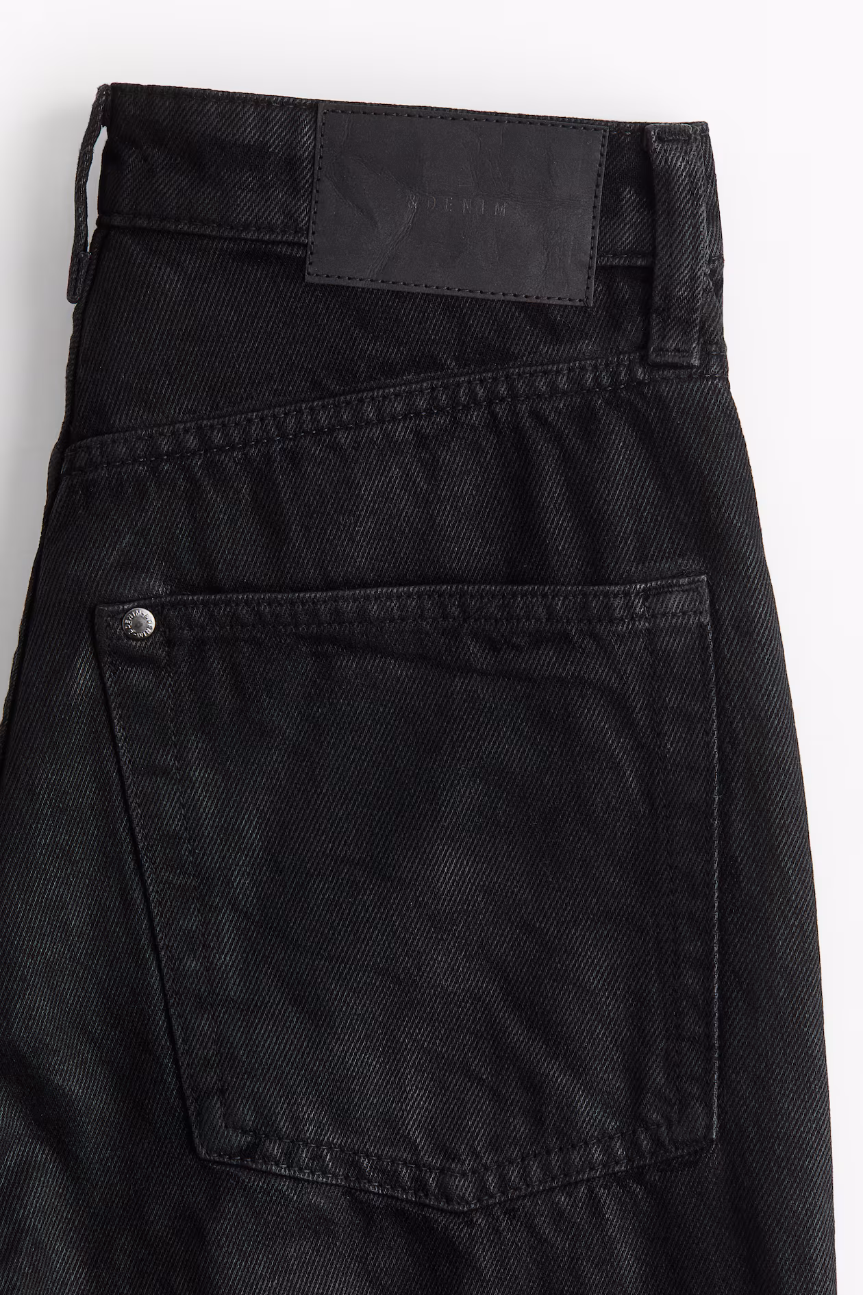 5-pocket, wide-leg jeans in rigid cotton denim. Curvy fit, designed to reduce gaping at waist with more room through hip and thigh. Straight, wide cut from thigh to hem. Extra-high waist and zip fly with button. Regular length, designed to fall at top of foot with little or no stacking. A denim statement that goes the distance.