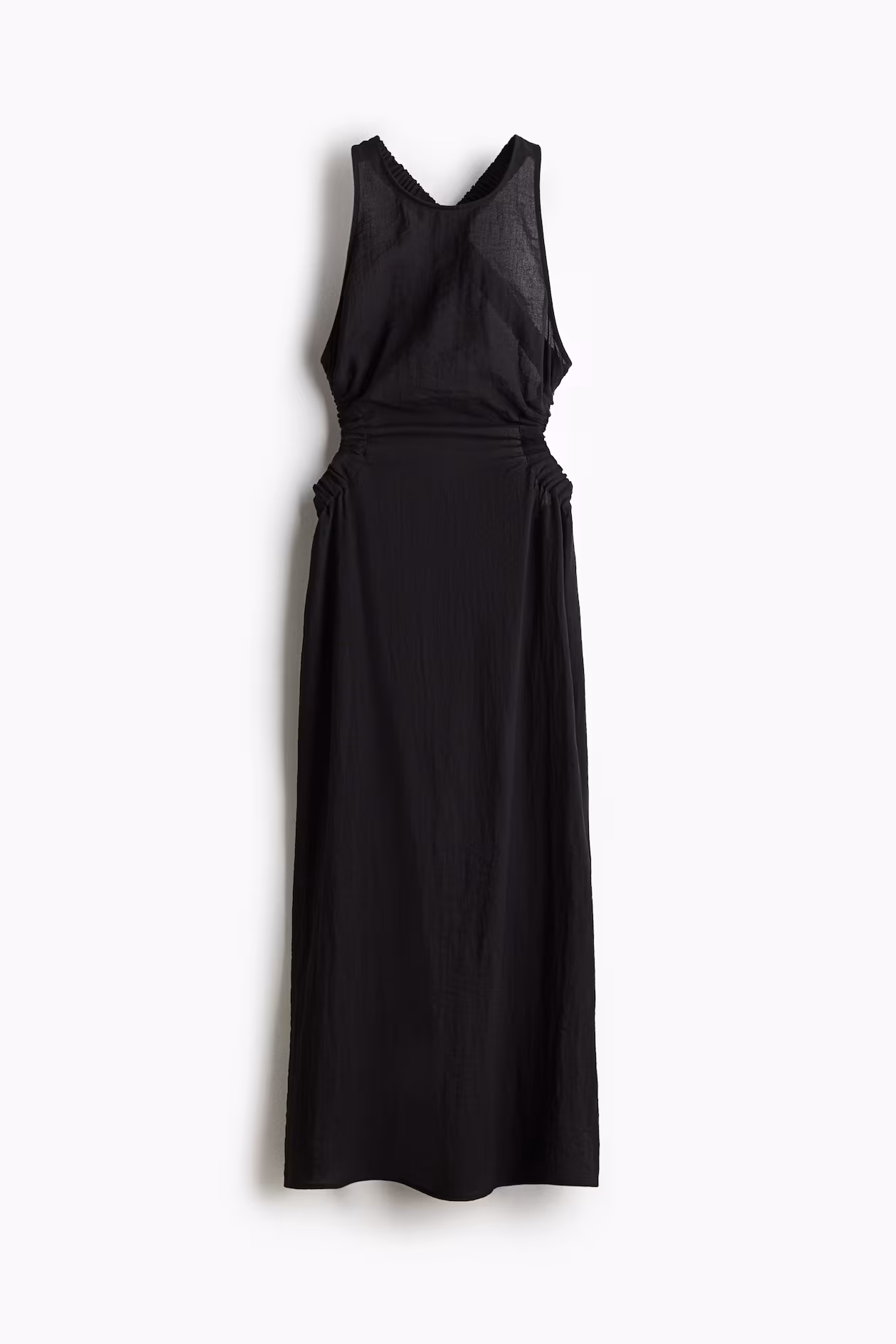 Calf-length dress in an airy, woven viscose blend. Wide, elasticized shoulder straps crossed at back, round neckline at front, and an open back. Cutouts at sides with covered elastic around edges that form gathers at front and back. Unlined.