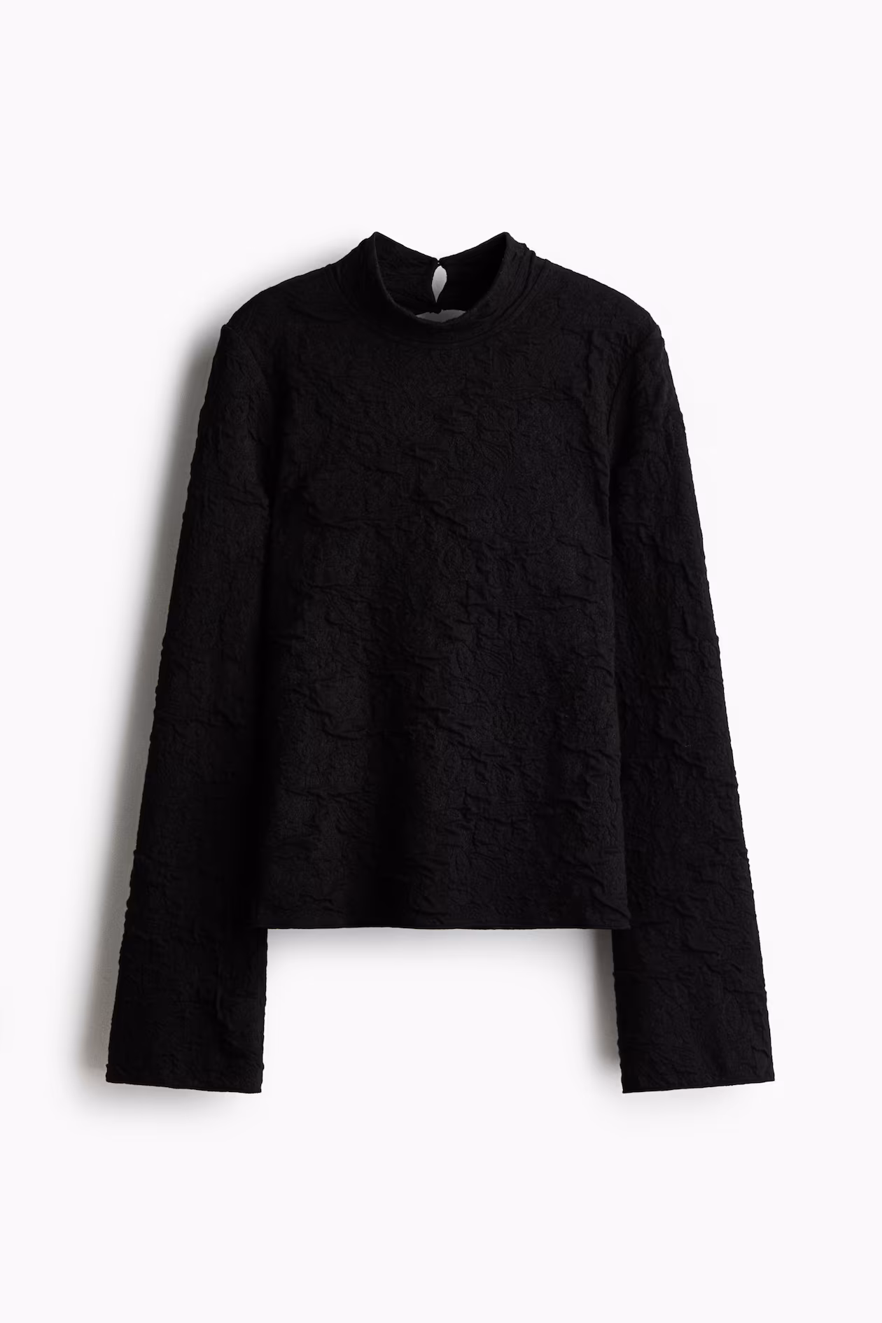 Fitted top in jacquard jersey. Stand-up collar, button-loop fastening at back of neck, and a large cutout section at back. Long sleeves with gently flared cuffs.