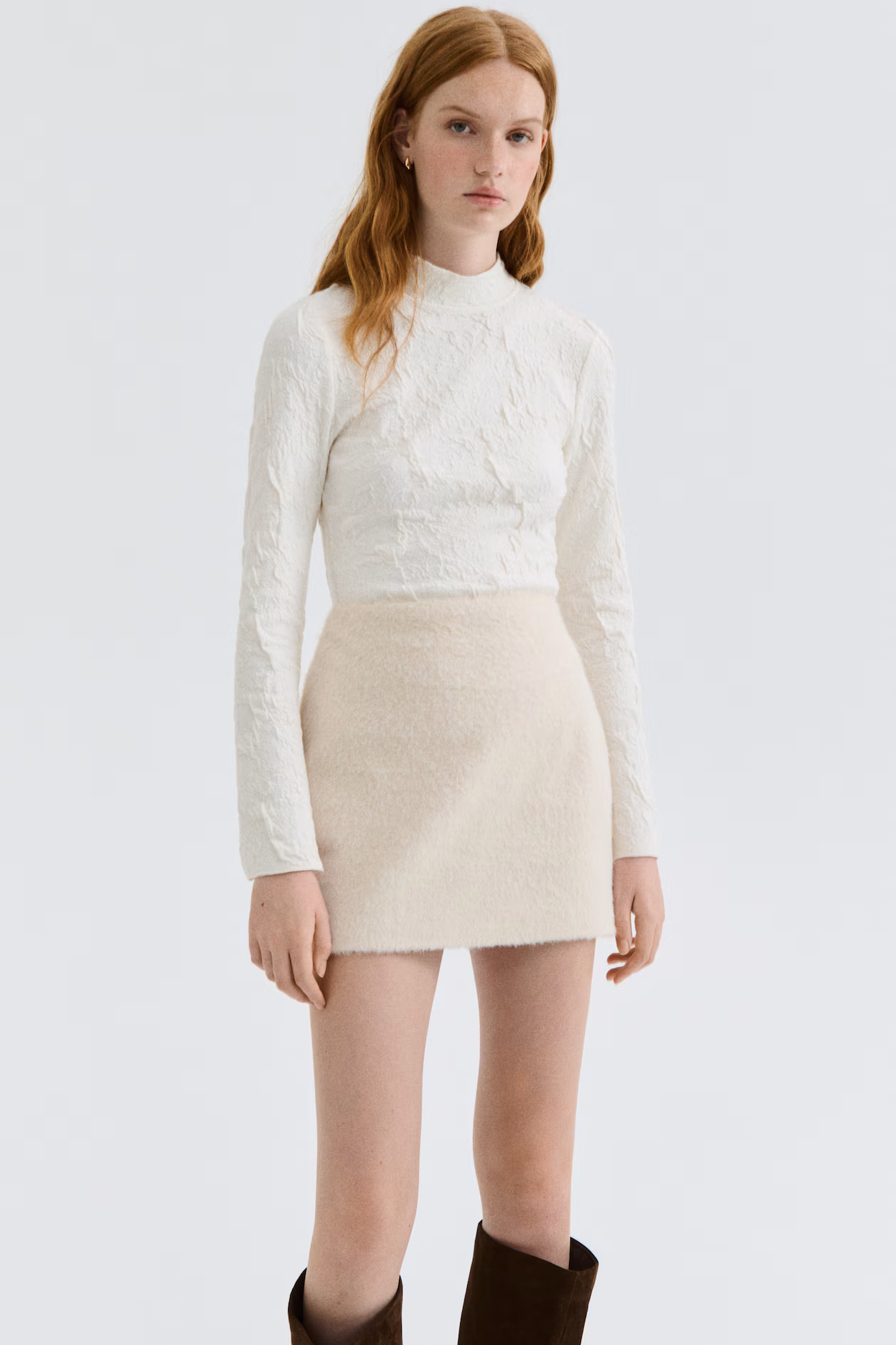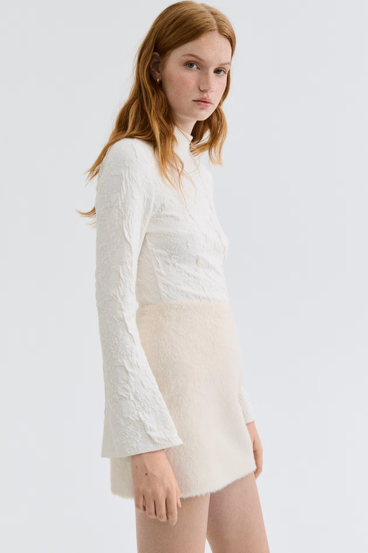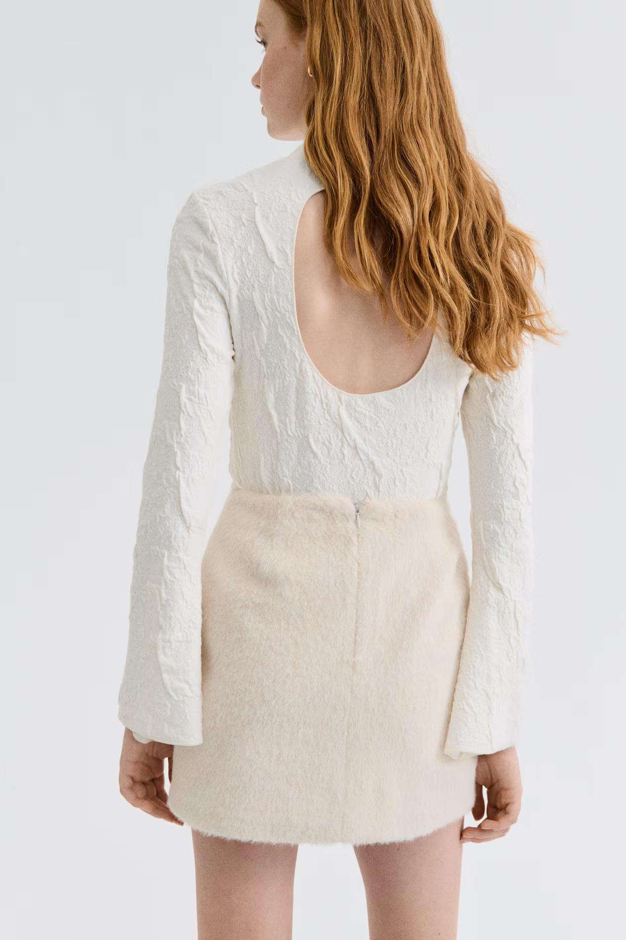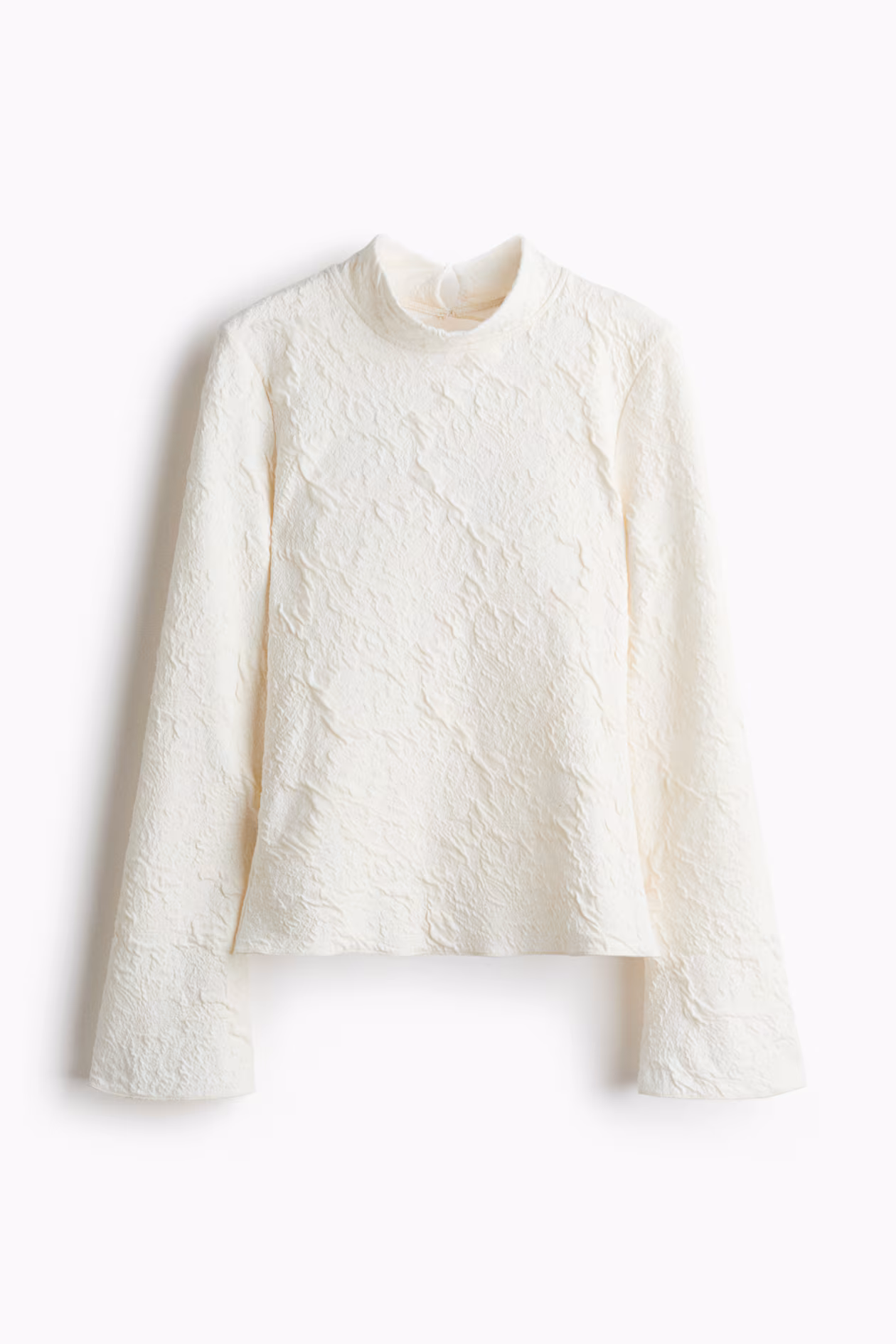 Fitted top in jacquard jersey. Stand-up collar, button-loop fastening at back of neck, and a large cutout section at back. Long sleeves with gently flared cuffs.