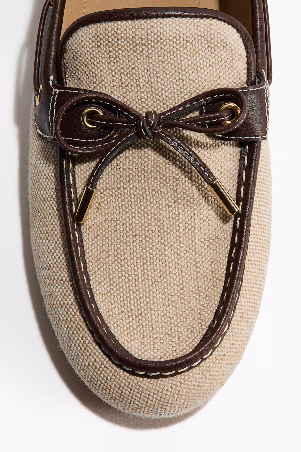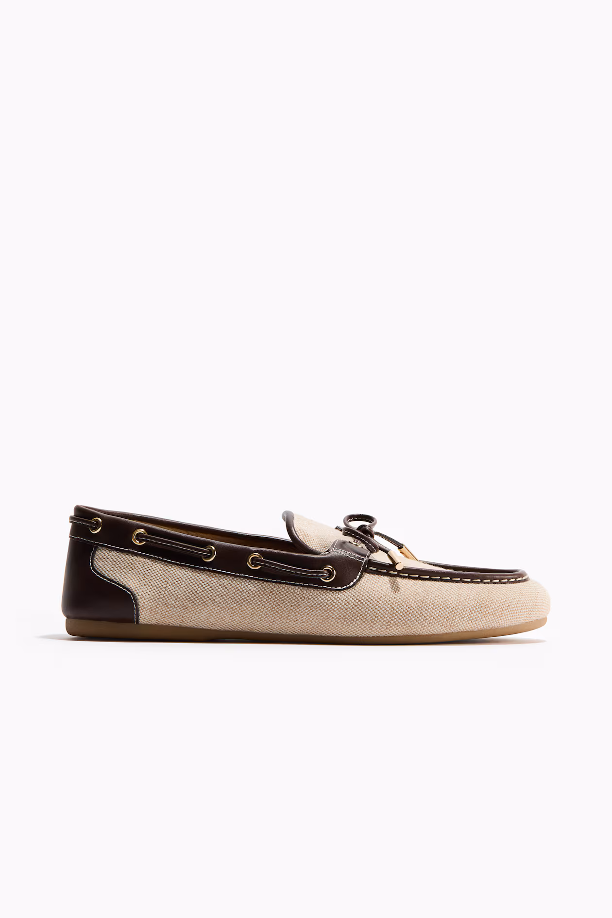 Deck shoes with a moccasin seam at front, lacing at top, and decorative lacing at sides and back. Lining in cotton twill.