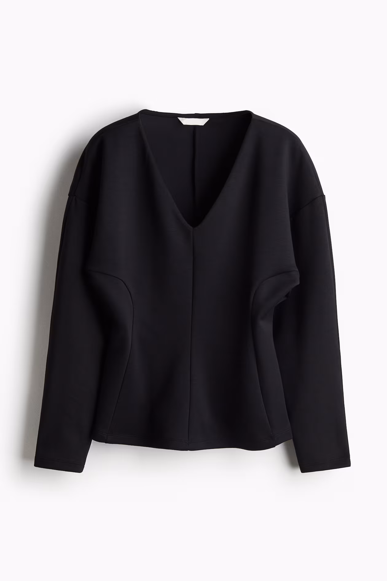 V-neck top in soft scuba fabric with a defined waist for a flattering silhouette. Dropped shoulders and long sleeves, tapered to cuffs.