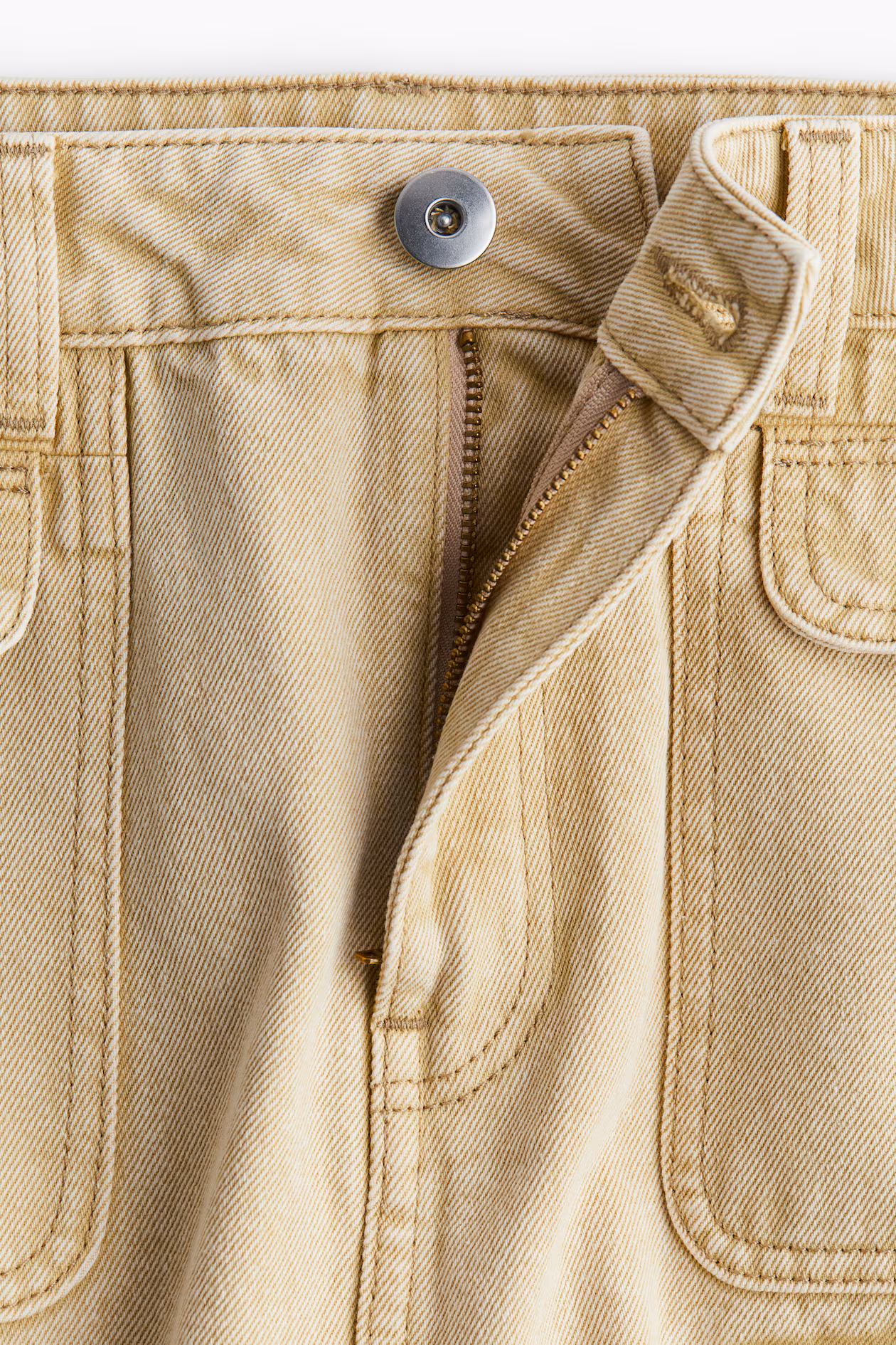 Fitted, ankle-length skirt in rigid cotton denim. Zip fly with button, open back pockets, and multiple front pockets with flap. Straight-cut hem with high slit at front.