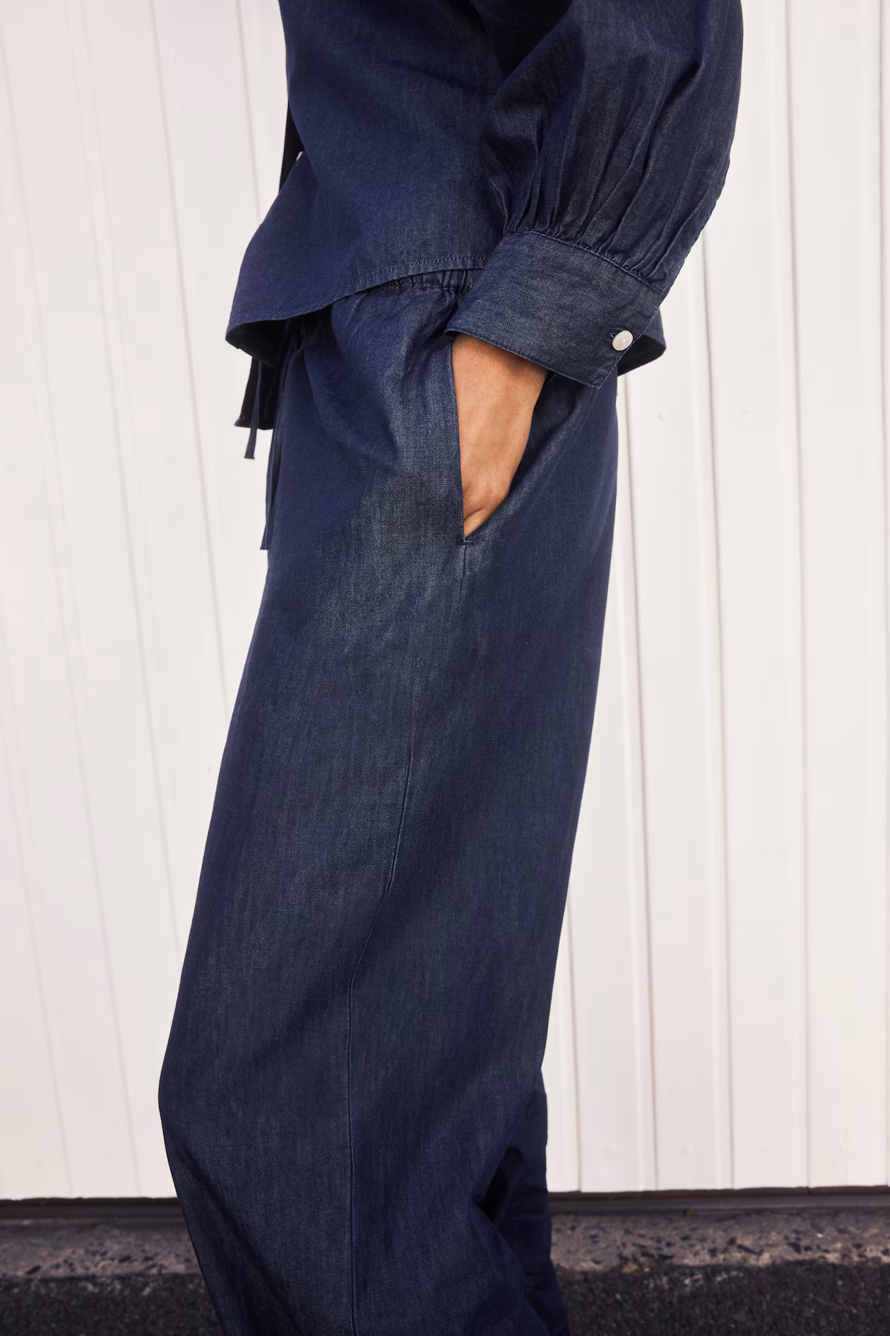 Pants in cotton denim. Elasticized, drawstring waistband and straight legs.