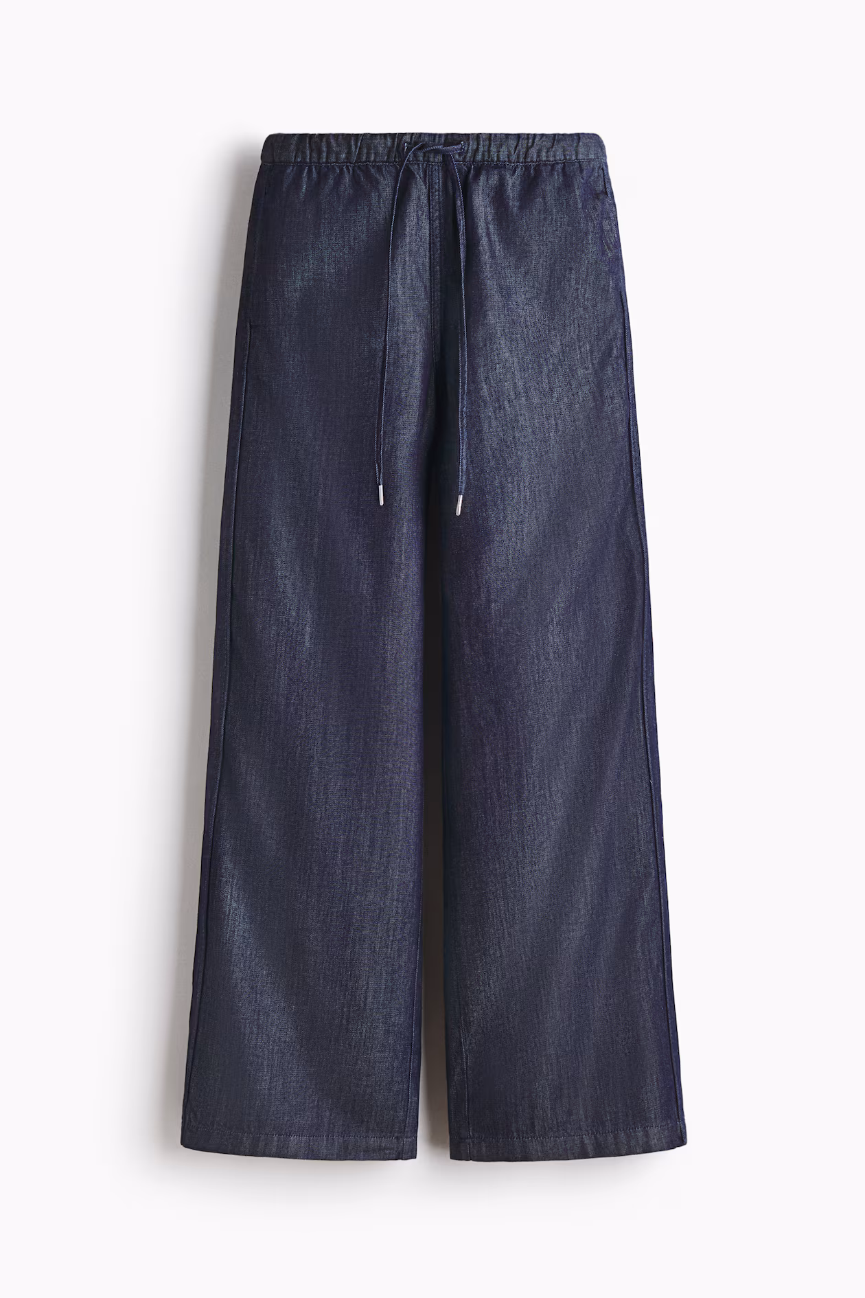 Loose-fit, wide-leg pants in rigid denim made from a cotton and lyocell blend. Elasticized, drawstring waistband, discreet side pockets, and welt back pockets.