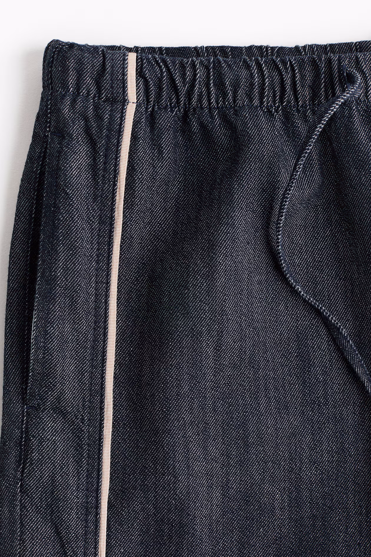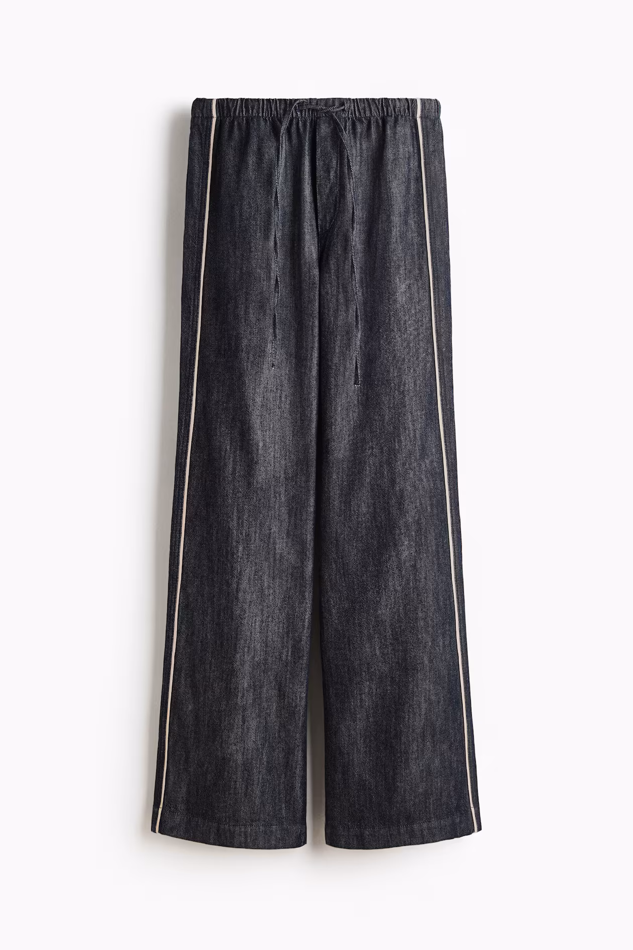 Loose-fit pants in cotton denim. High waist, narrow drawstring and covered elastic at waistband, and a mock fly. Discreet side pockets and straight legs with accent-color piping at sides.