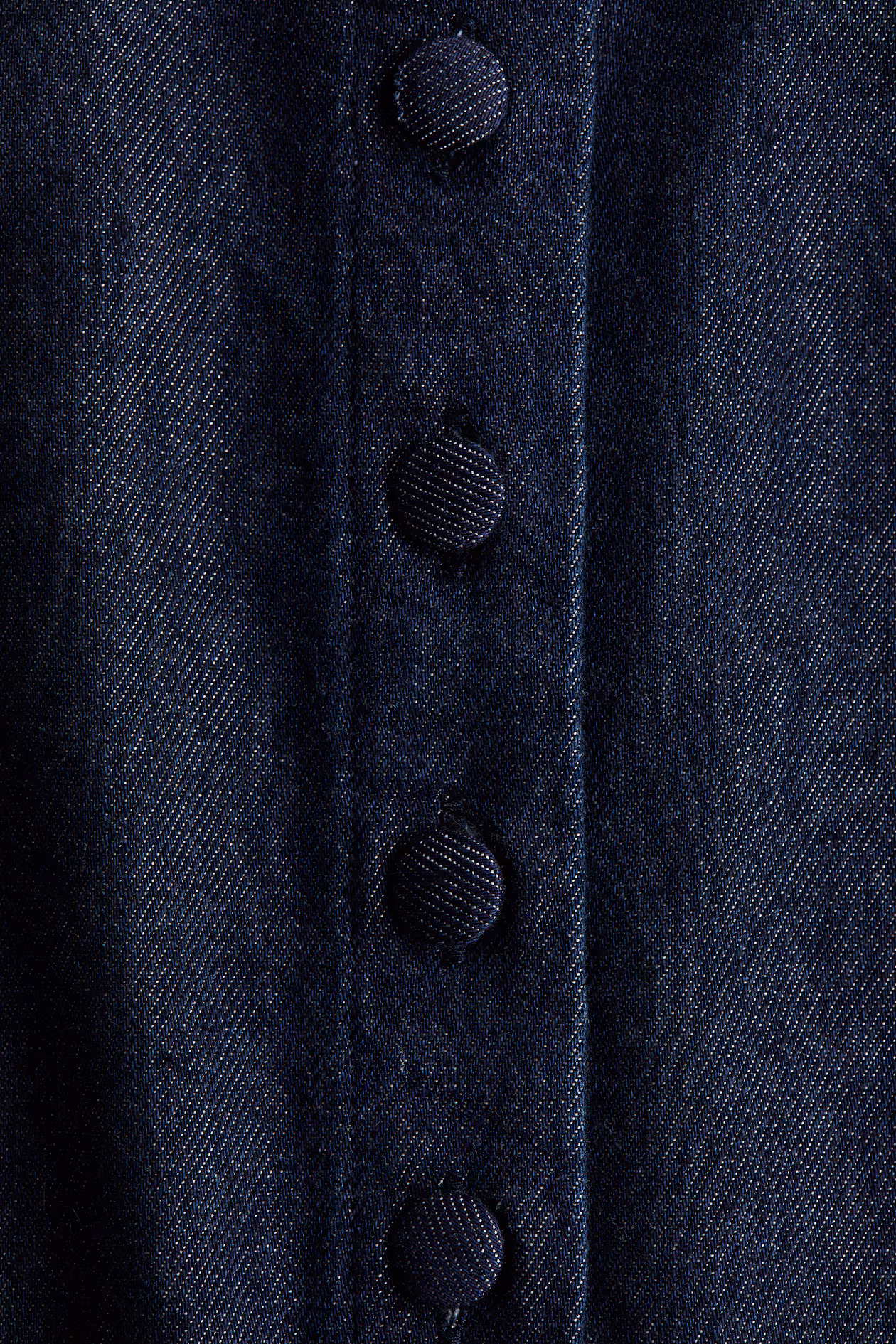 Short, fitted dress in rigid cotton denim. Round neckline, covered buttons full length of front, and lined puff sleeves with narrow elastic at cuffs.