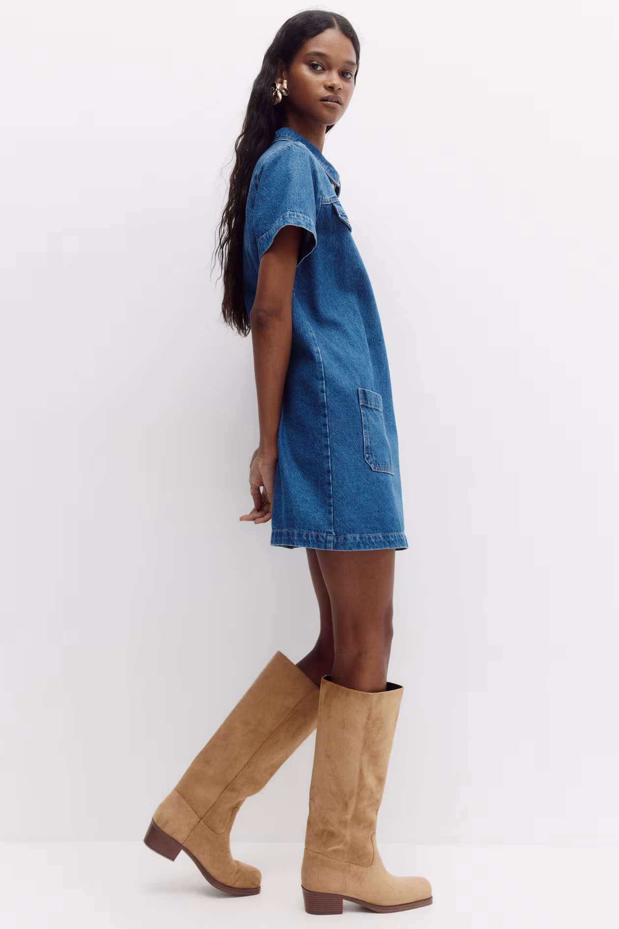 Short dress in rigid denim. Collar, short button placket, and short sleeves. Mock chest pockets with flap and button, and patch front pockets.