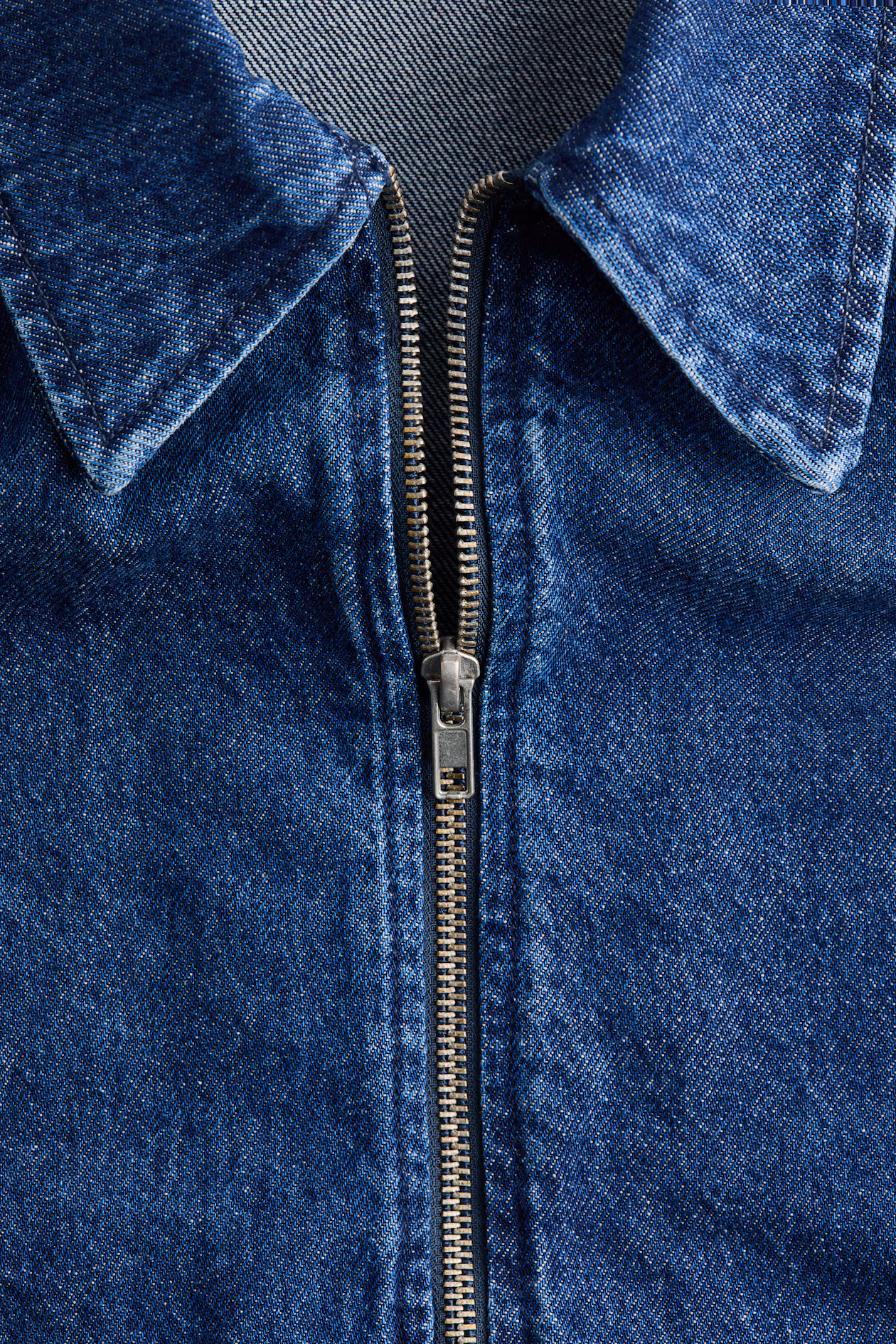 Short jacket in rigid cotton denim. Collar, zipper at front, dropped shoulders, and welt front pockets. Drawstring at hem.
