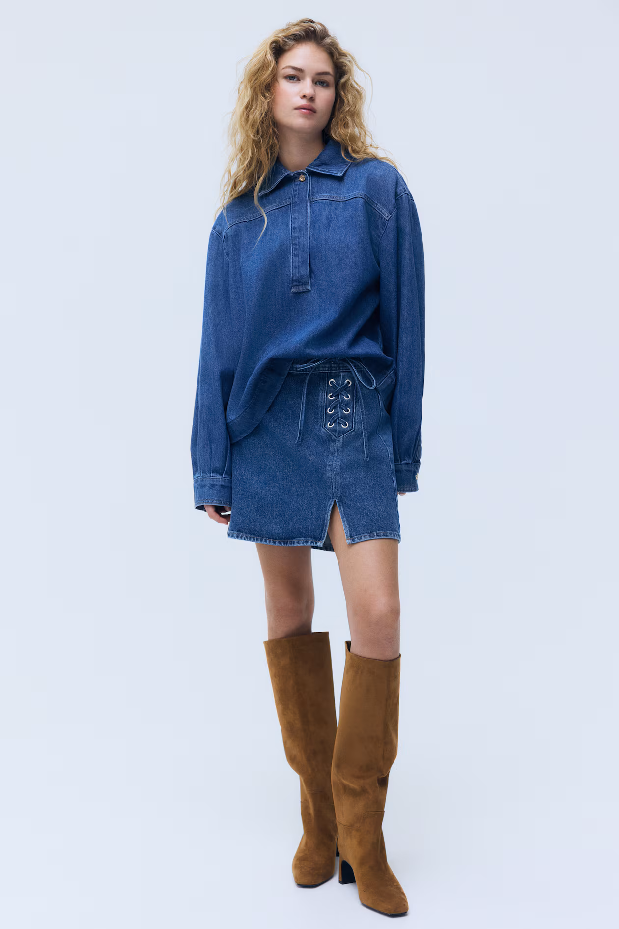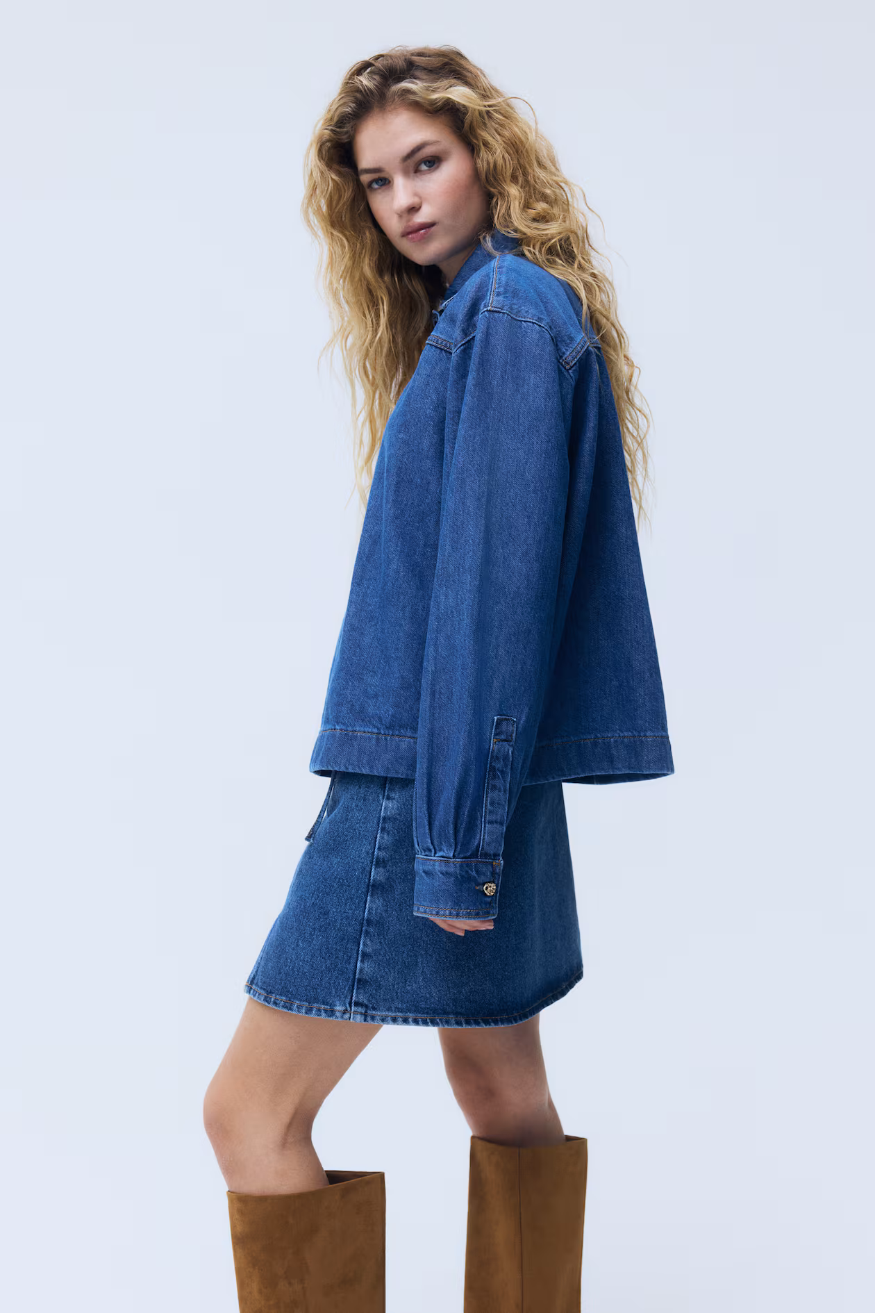 Pullover shirt in rigid denim. Collar, button placket with one visible and one concealed button, and a yoke at front and back with a box pleat at back. Dropped shoulders, long sleeves, sleeve placket, and button at cuffs.