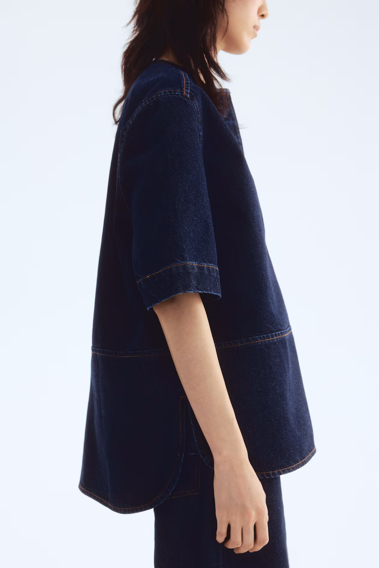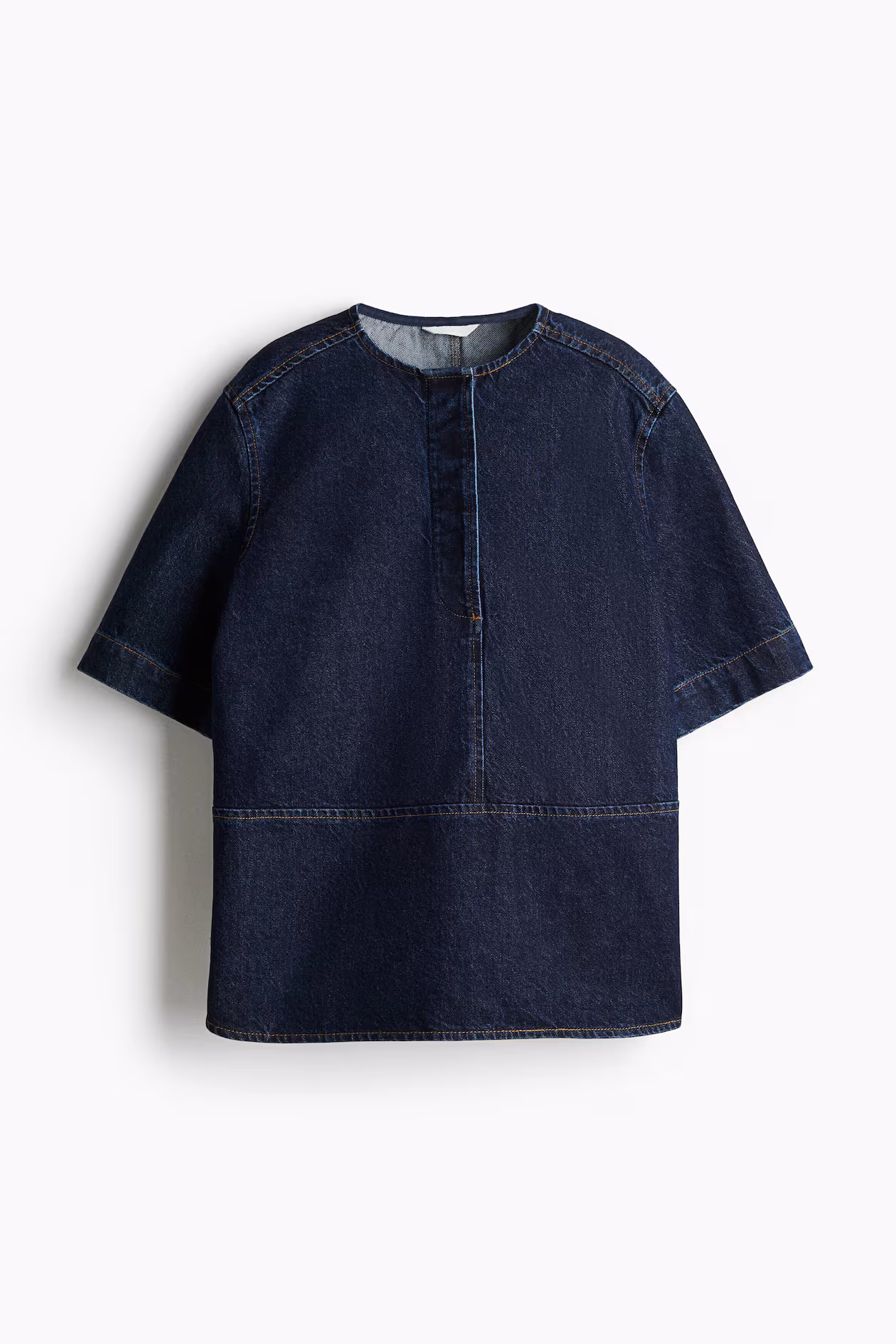 Oversized top in cotton denim with visible seams at front and back. Round neckline, placket with concealed buttons, and elbow-length sleeves. Straight-cut hem with curved side vents.