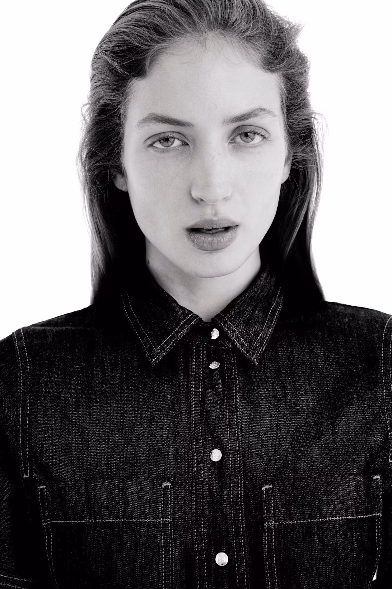 Calf-length dress in cotton denim. Collar, snap fasteners at front with a motif, patch chest pockets, and short sleeves with foldover cuffs. Tie belt at waist and a flared skirt.