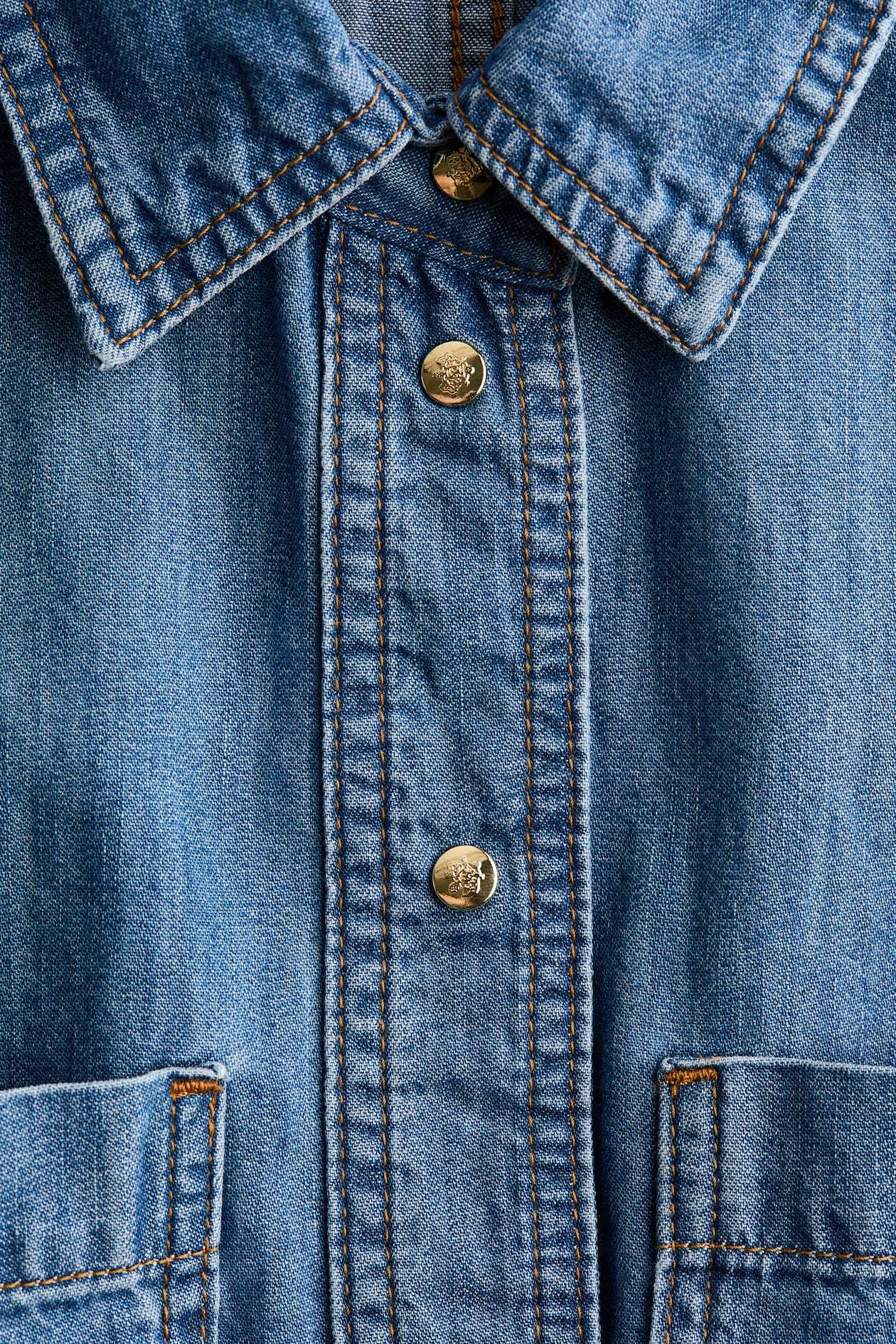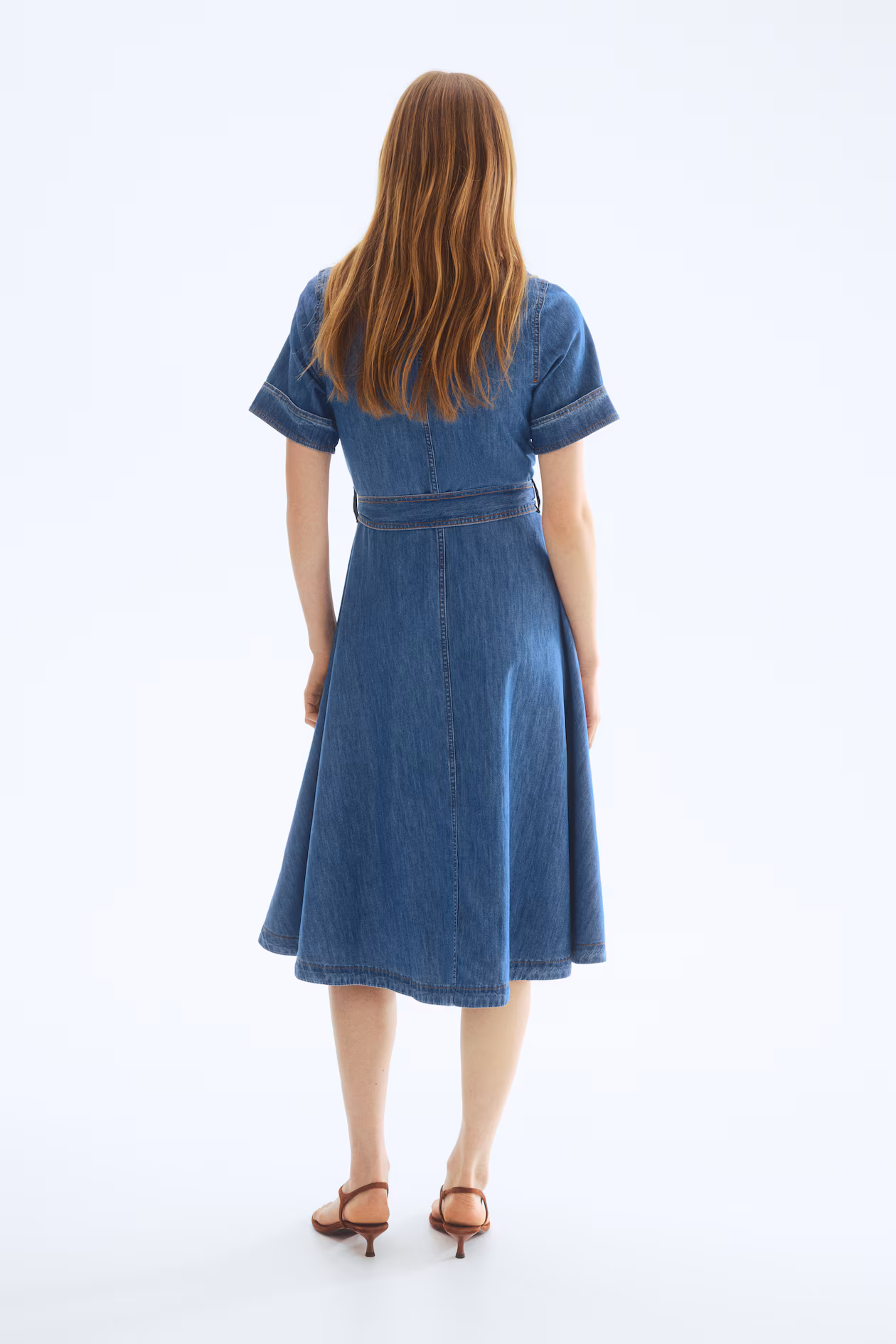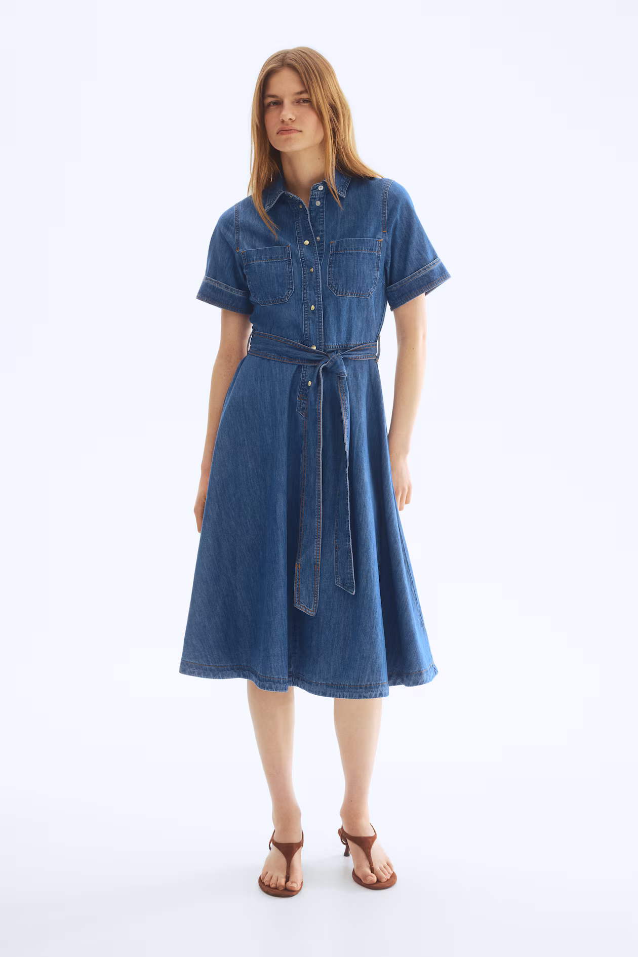 Calf-length dress in cotton denim. Collar, snap fasteners at front with a motif, patch chest pockets, and short sleeves with foldover cuffs. Tie belt at waist and a flared skirt.