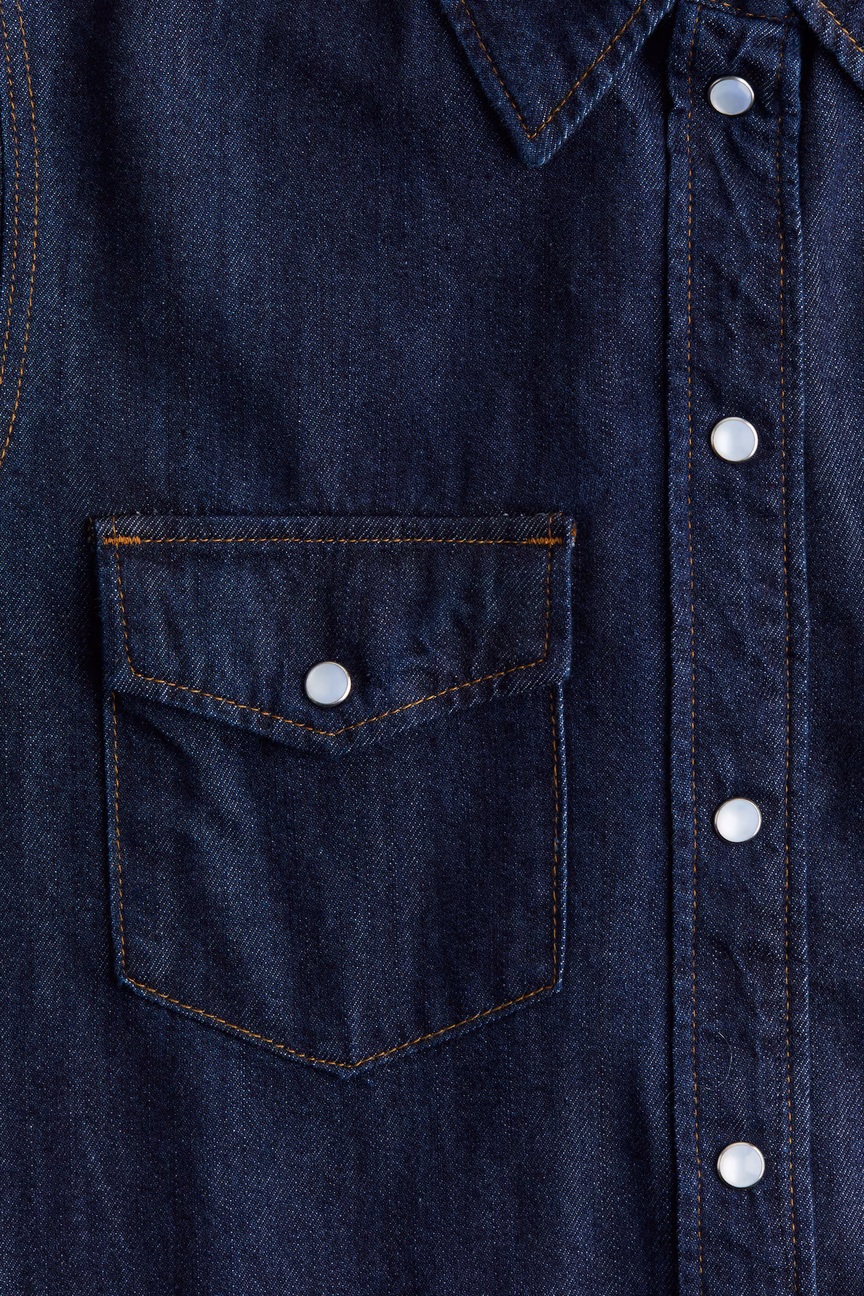 Shirt in denim. Collar, snap fasteners at front, and a V-shaped yoke at back. Patch chest pockets with flap and snap fastener, long sleeves with snap fasteners at cuffs, and a gently rounded hem.