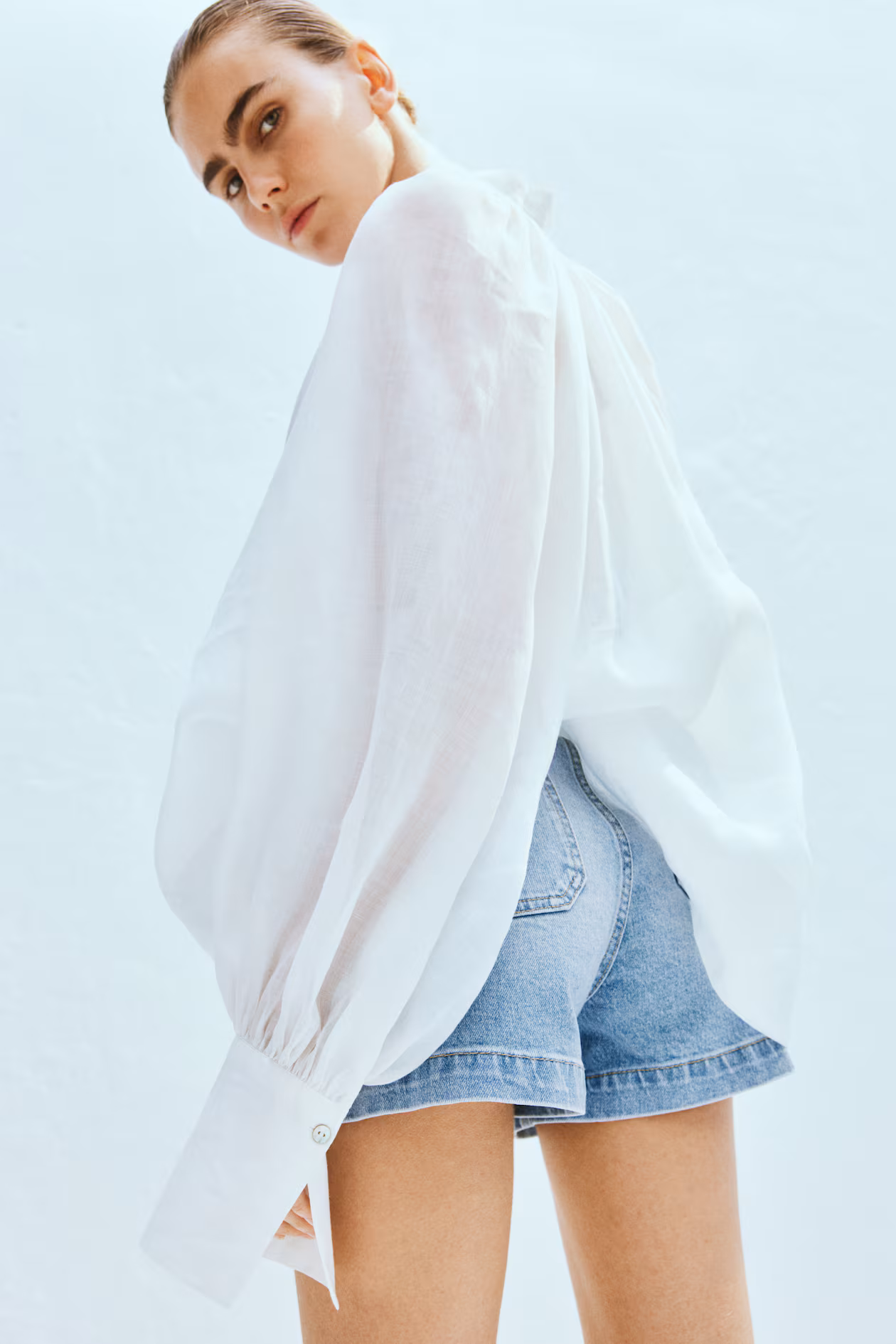 Shorts in cotton denim with gentle stretch. High waist, zip fly with button, patch front pockets, and patch back pockets.