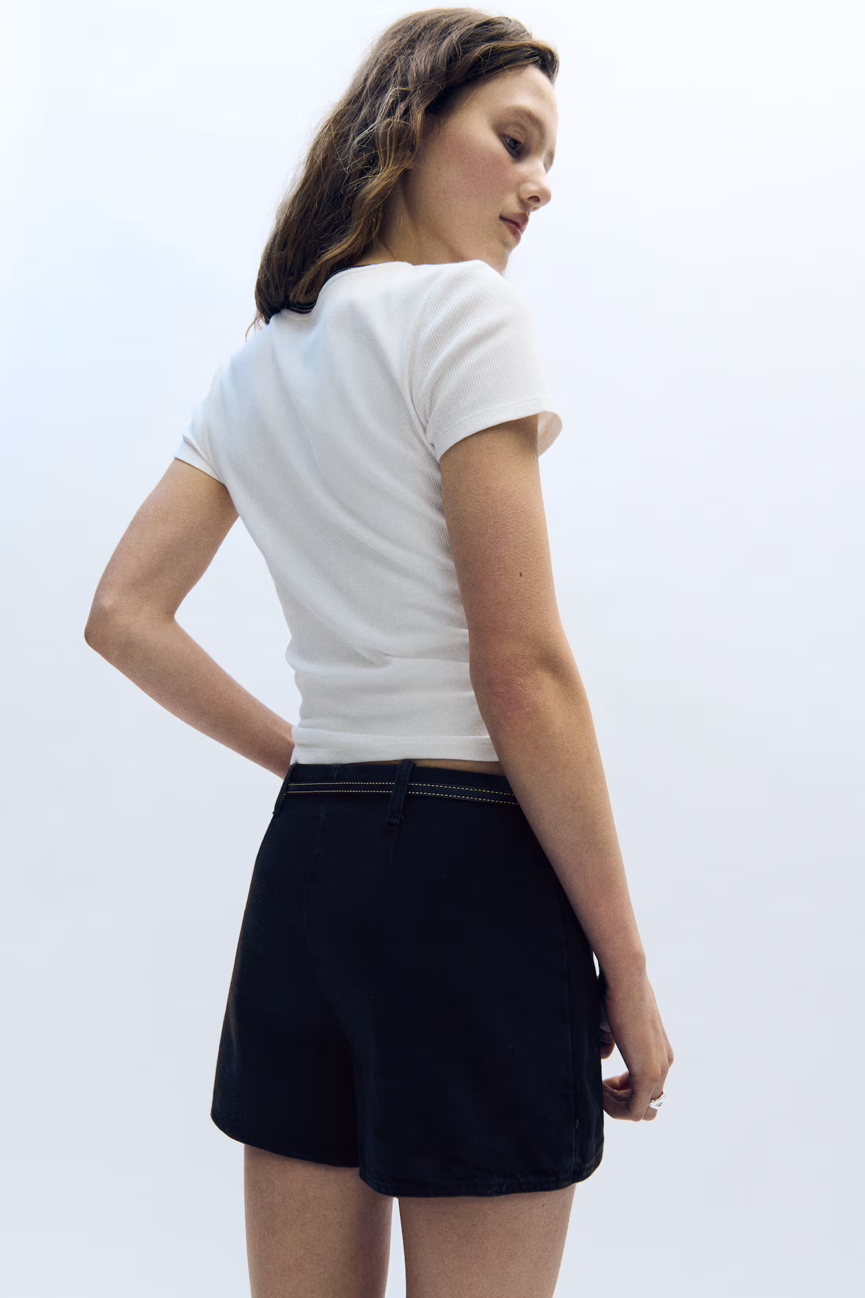 Short skort in rigid cotton denim with a concealed zipper at one side.