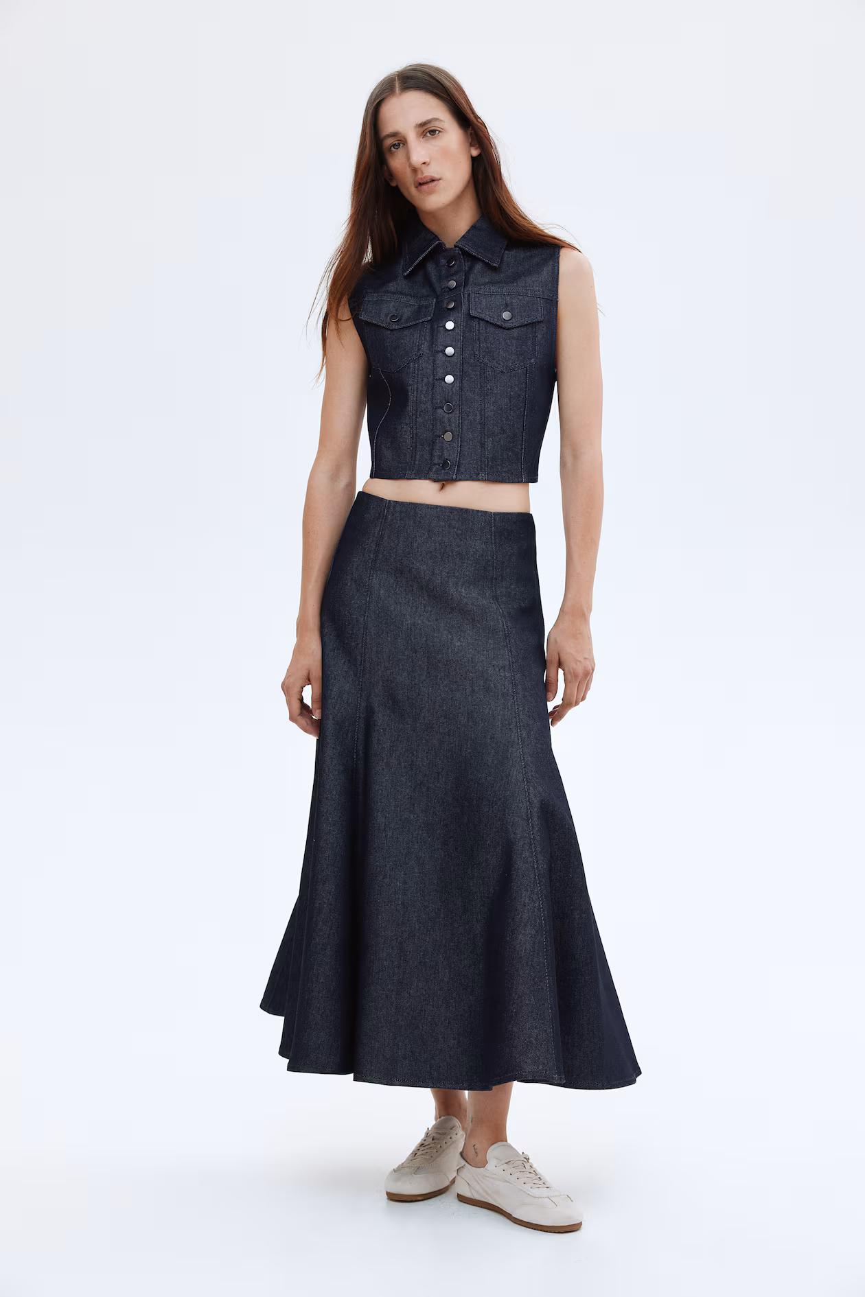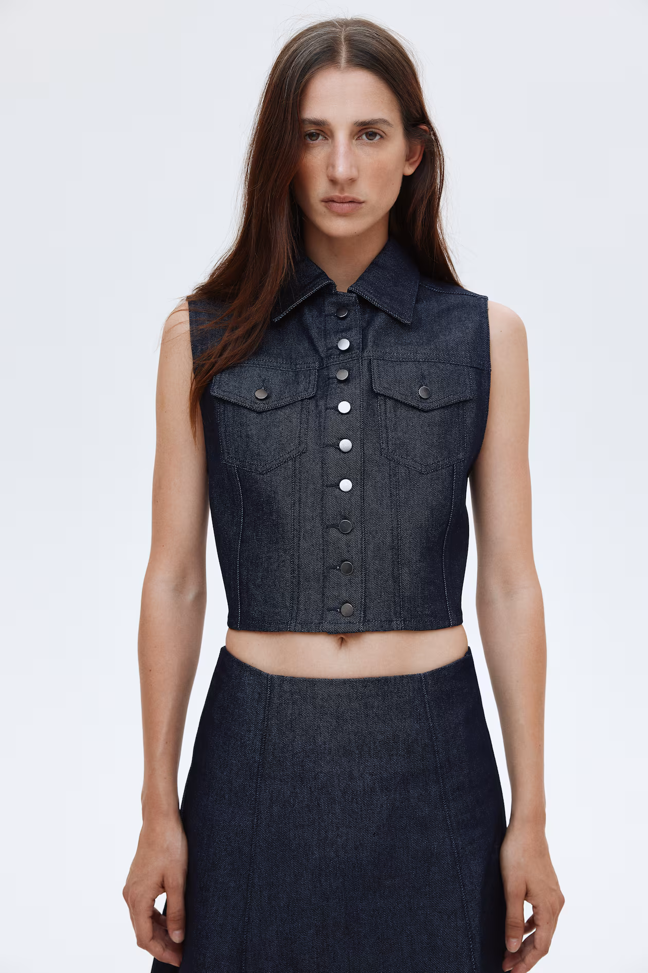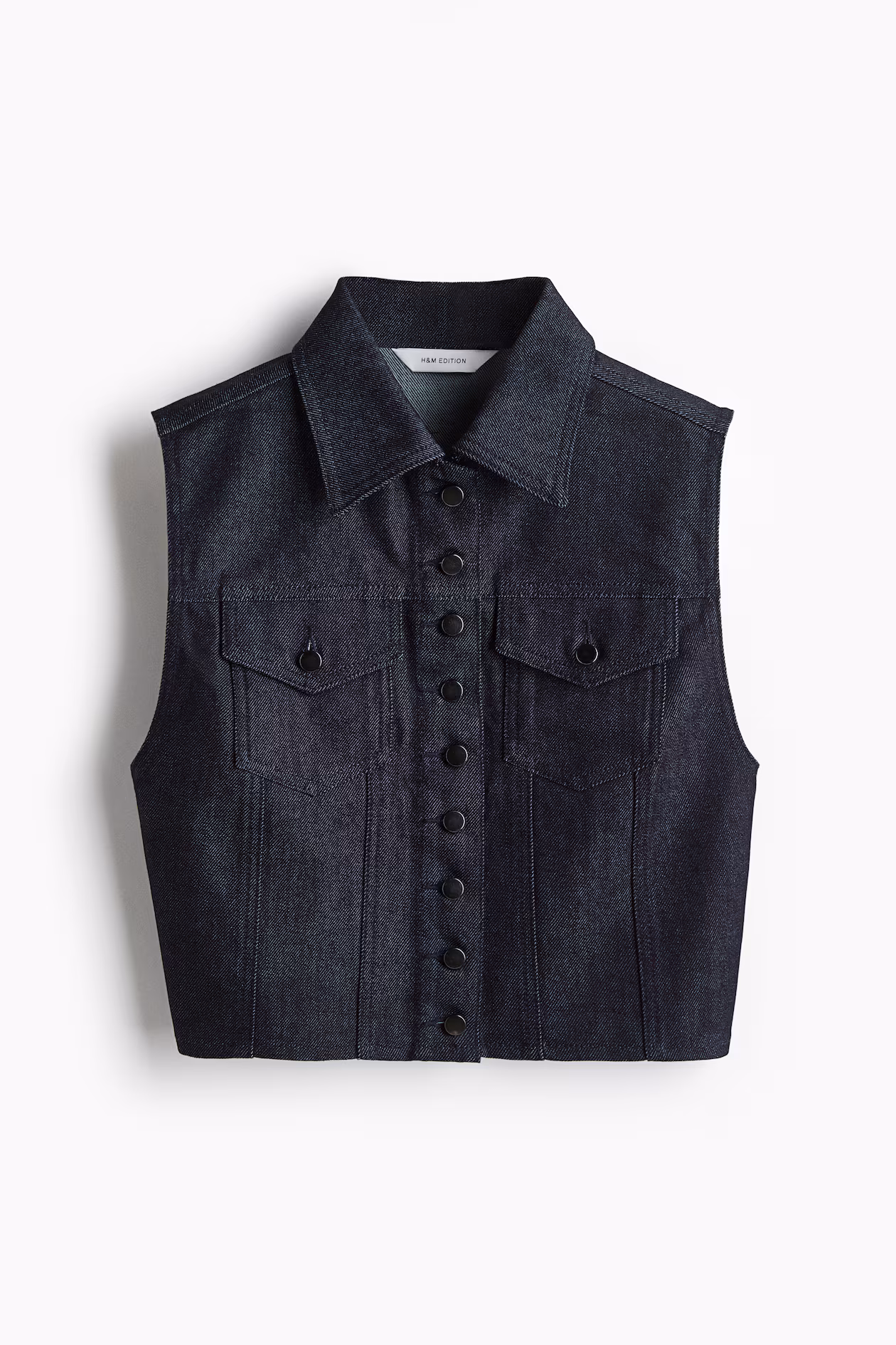 Short, fitted vest in rigid cotton denim. Collar, metal buttons at front, and chest pockets with a flap and button. Yoke at front and back, and visible seams at front and back for added structure.