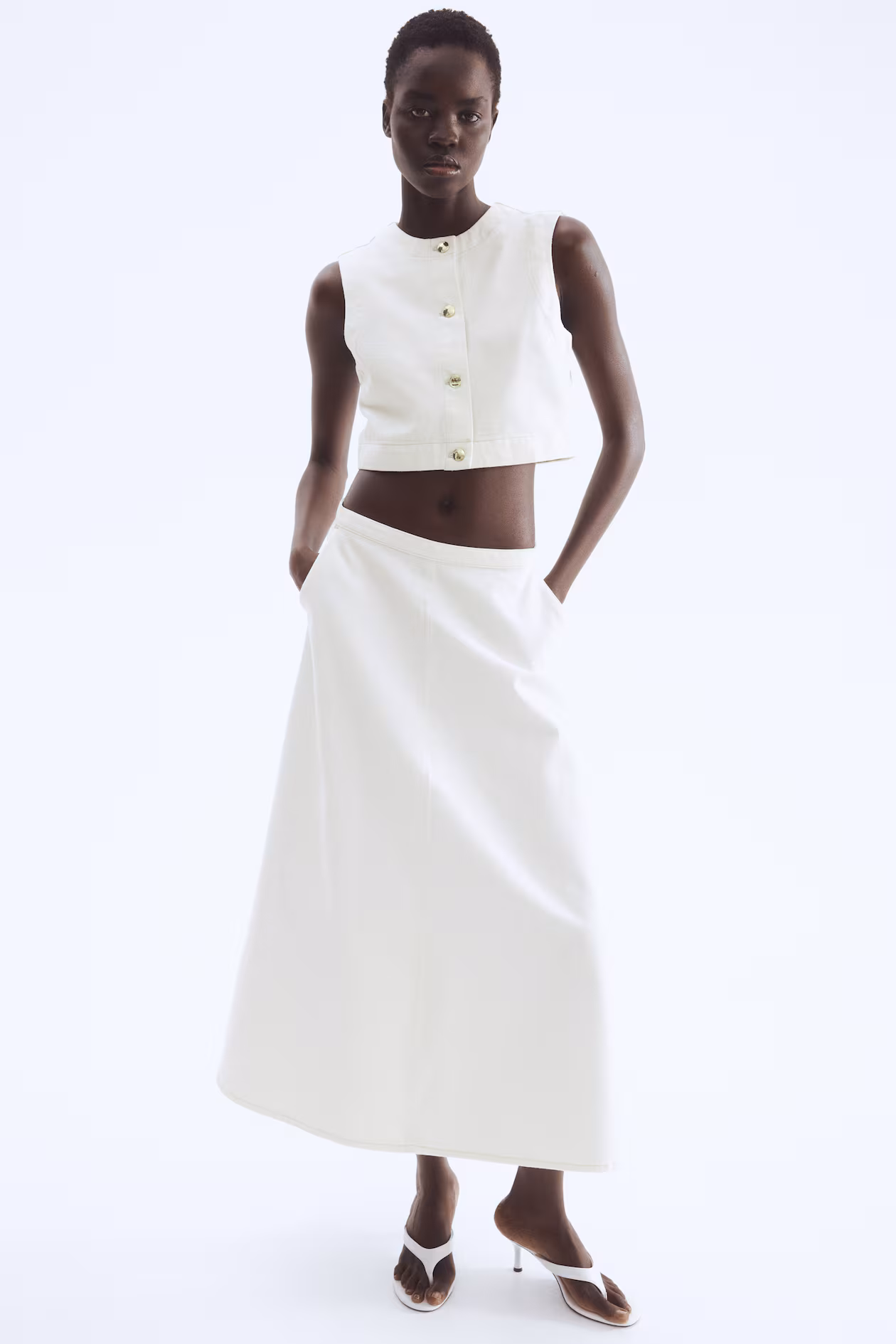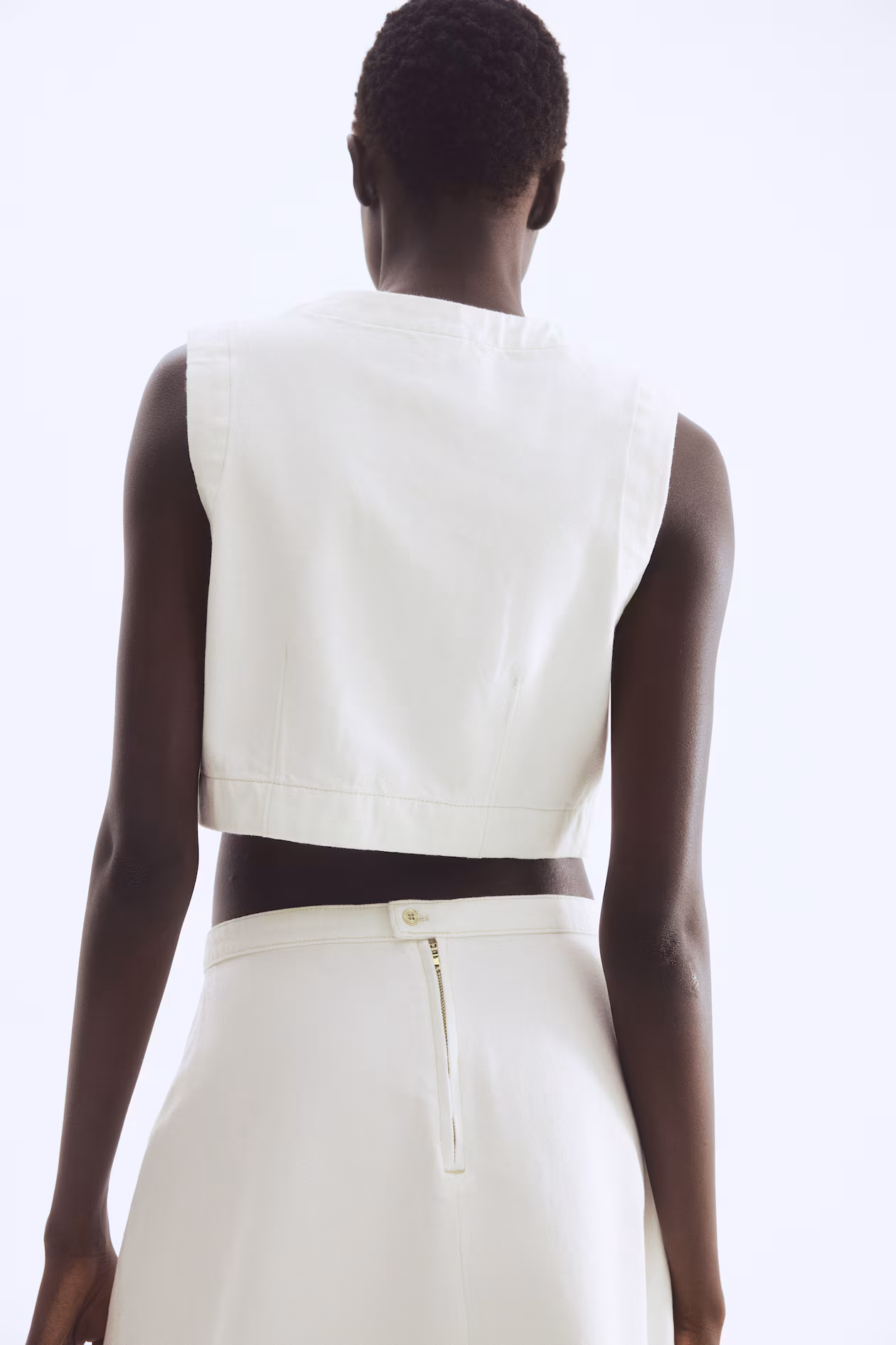 Fitted, cropped vest in cotton denim. Round neckline and metal buttons at front.