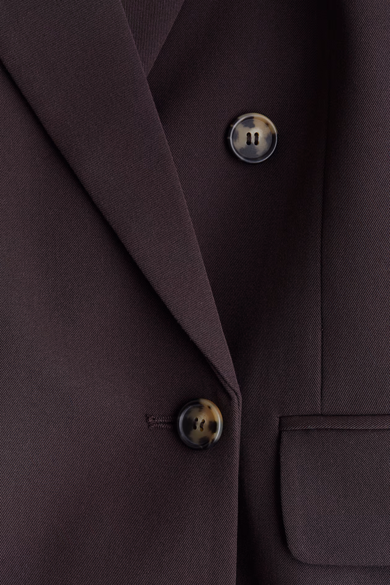 Slightly longer, double-breasted blazer. Notched lapels, buttons at front, and welt front pockets with flap. Shoulder pads and long sleeves. Lined.
