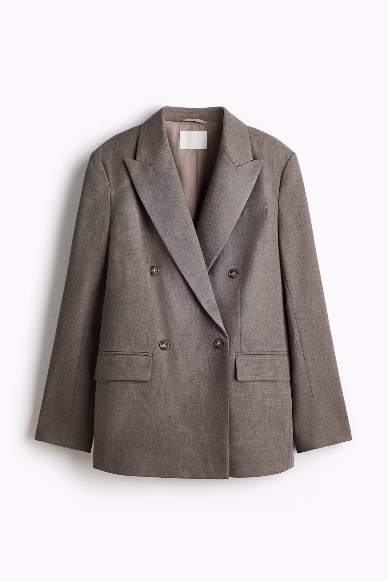 Double-breasted blazer in woven fabric. Pointed lapels, buttons at front, a welt chest pocket, and welt front pockets with flap. Shoulder pads and long sleeves with stacked buttons at cuffs. Vent at back. Lined.