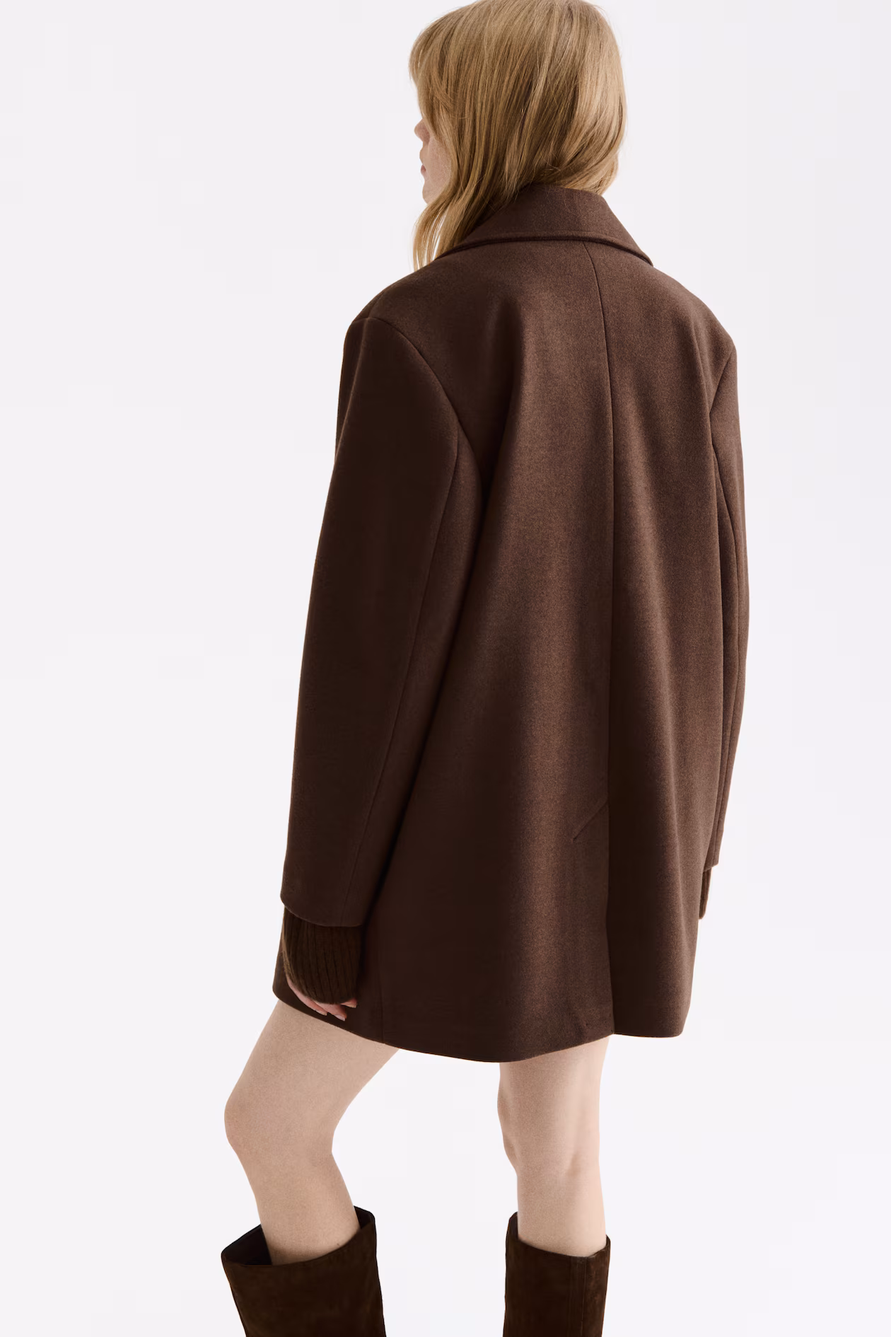 Double-breasted coat in felted fabric. Notched lapels, buttons at front, welt front pockets, and vent at back. Lined.