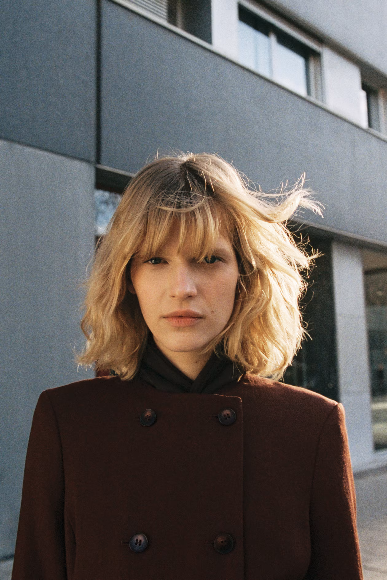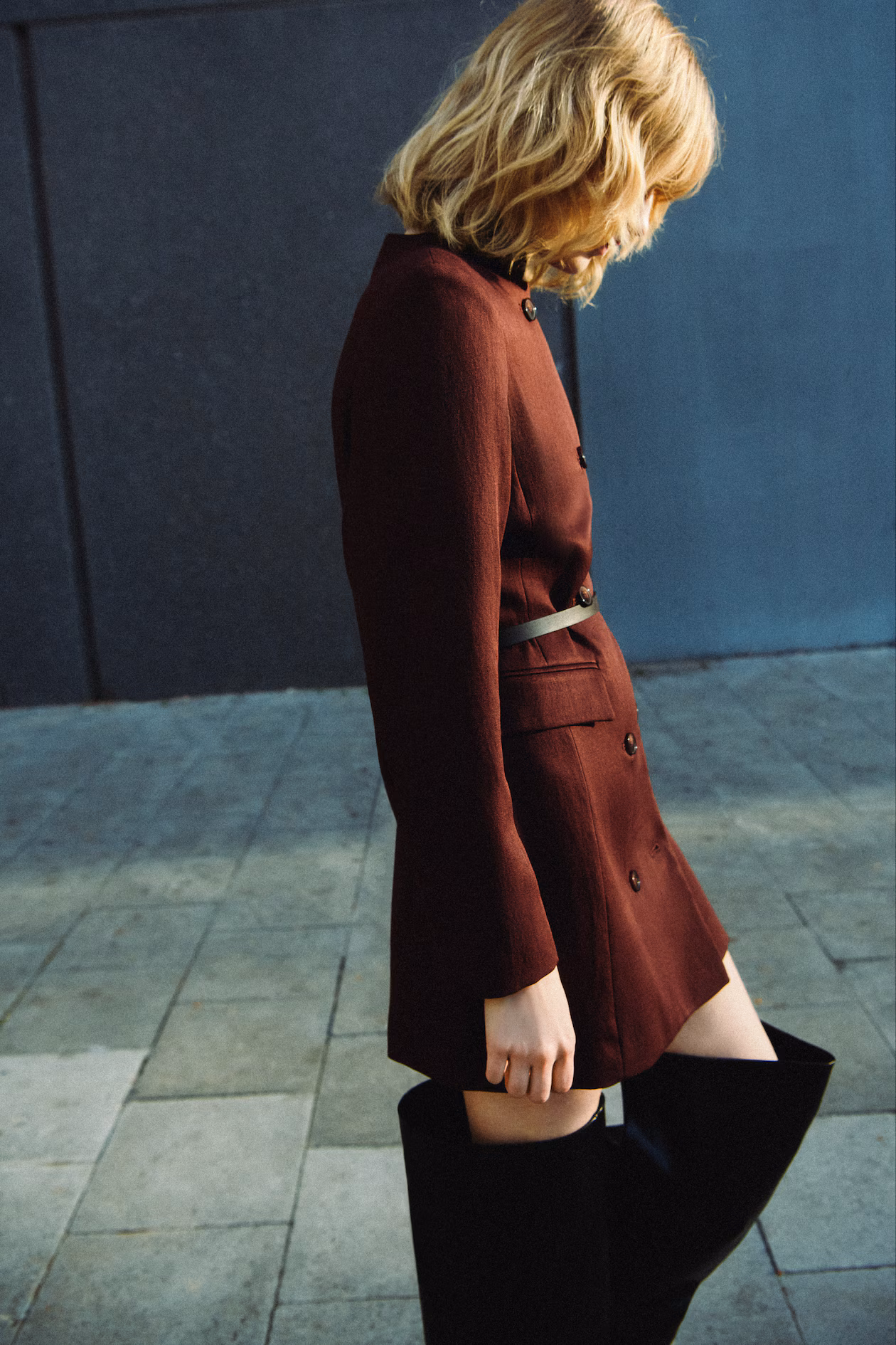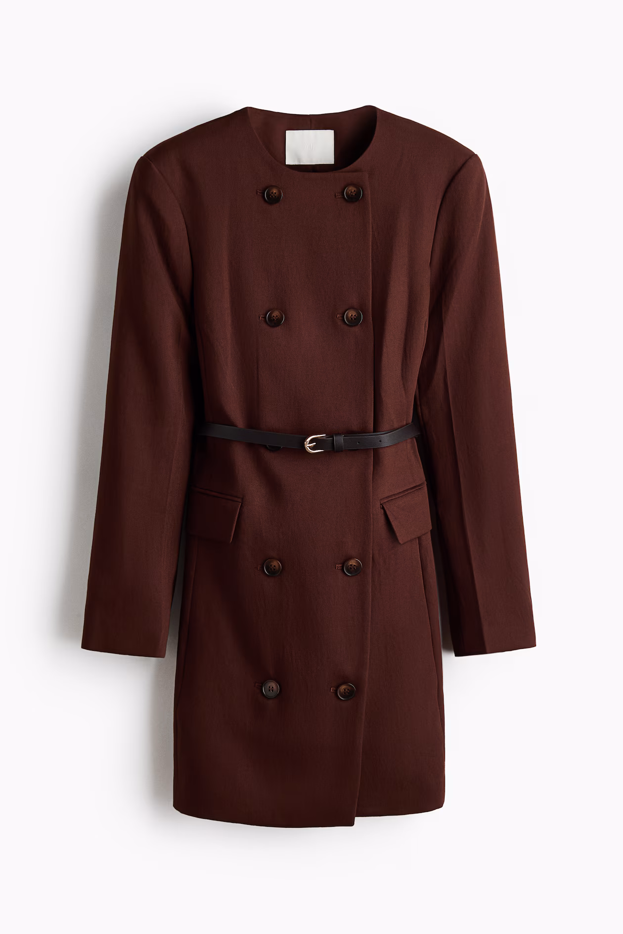 Short, double-breasted jacket dress in woven fabric. Round neckline, buttons full length of front, belt at waist with metal buckle, and welt front pockets with flap. Shoulder pads and long sleeves with pressed creases. Lined.
