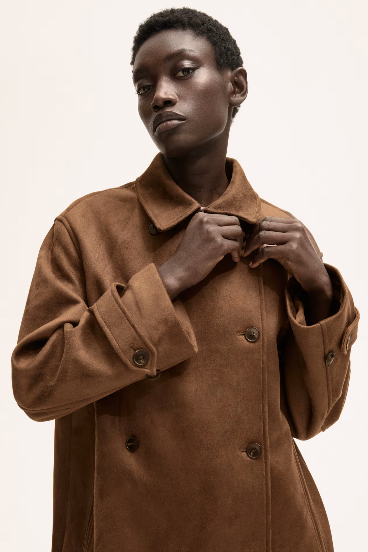 Double-breasted, A-line jacket in woven fabric with a soft, napped finish. Collar, welt side pockets, and adjustable tab at cuffs with button. Lined.