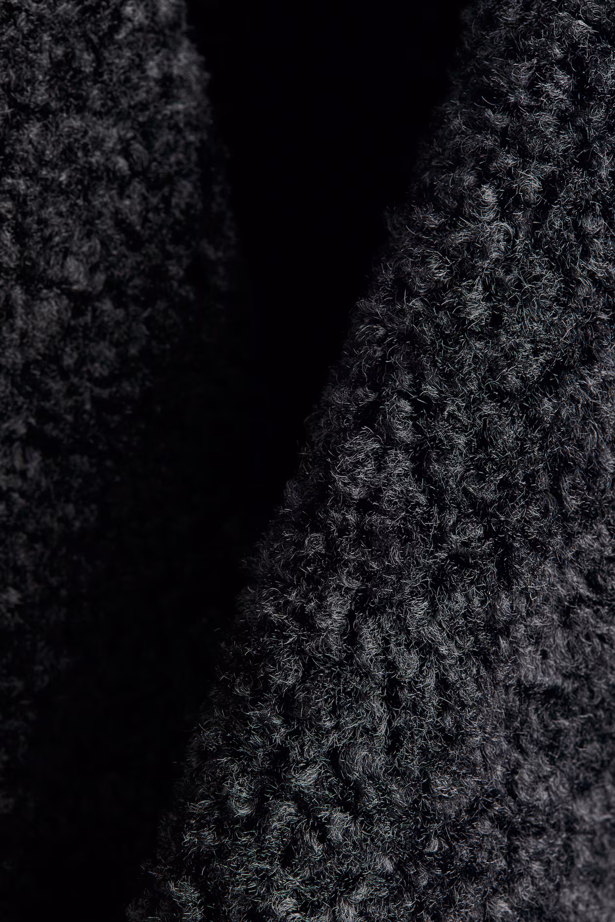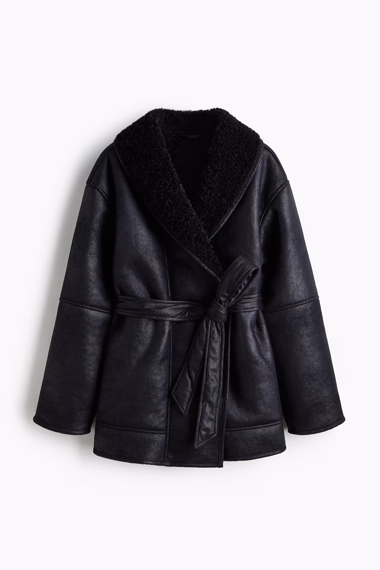 Oversized coat in coated fabric with visible seams throughout the design. Shawl collar in soft teddy fleece, removable tie belt at waist, and lining in soft teddy fleece.