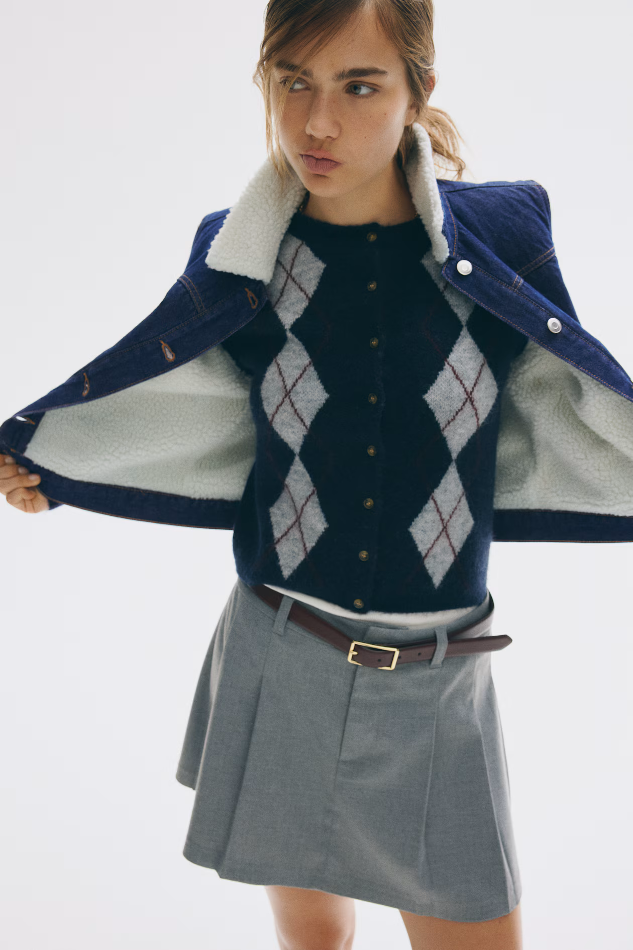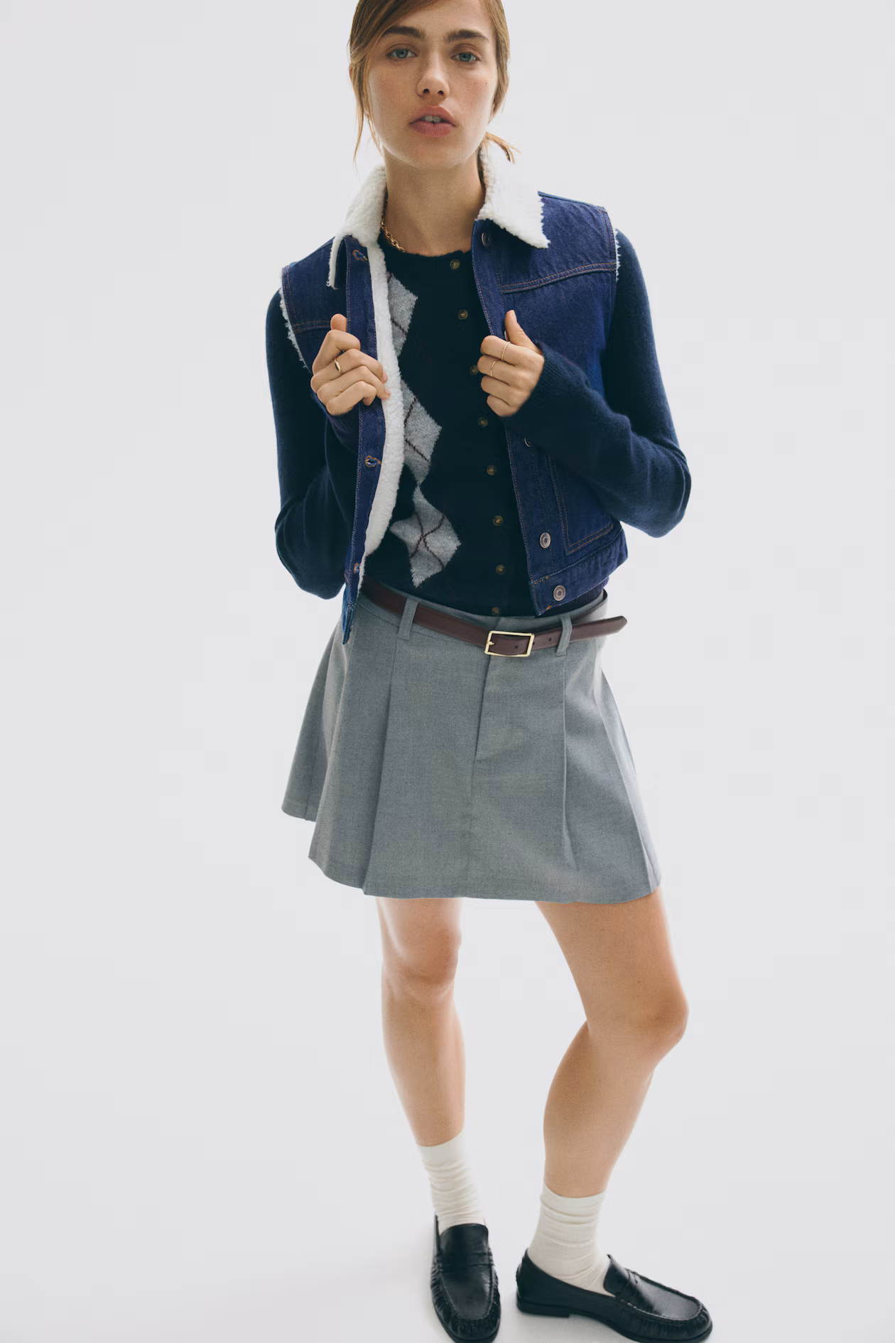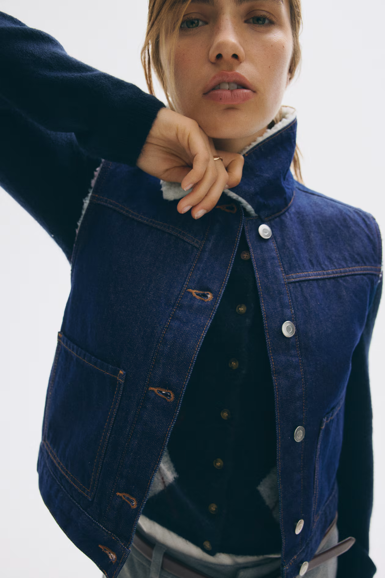 Fitted vest in rigid cotton denim with collar and lining in soft teddy fleece. Buttons at front, yoke at front and back, and open front pockets.