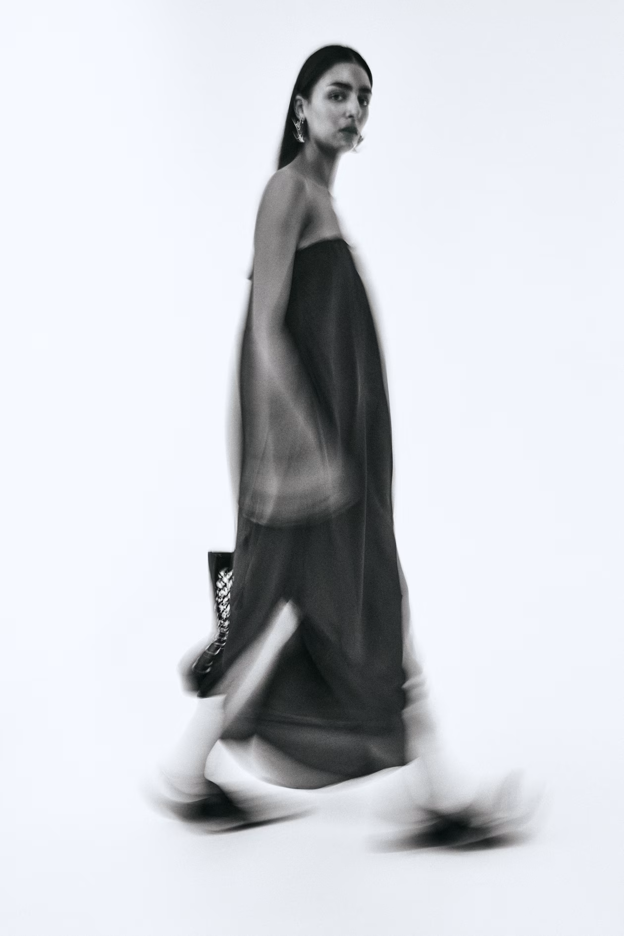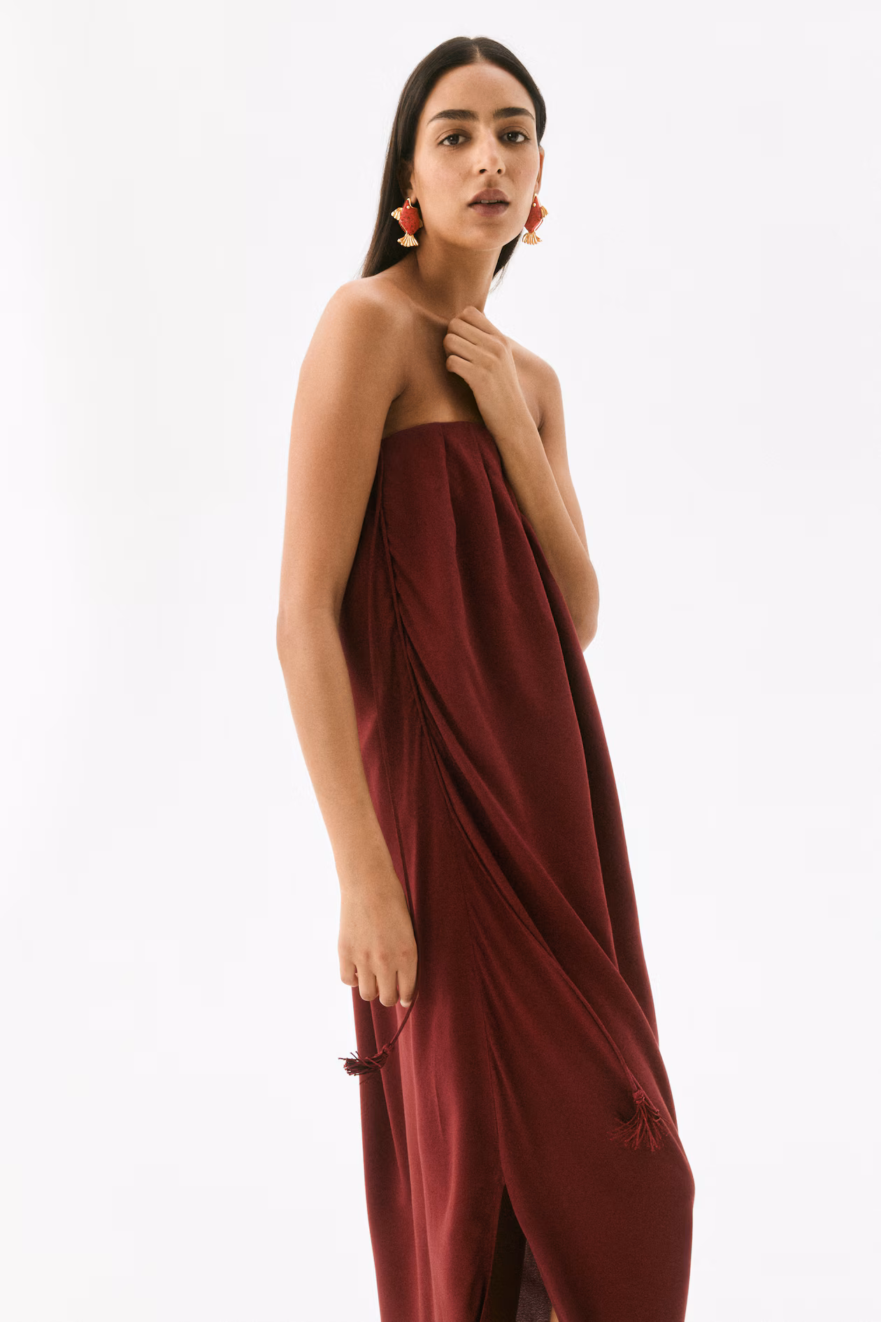 Calf-length bandeau dress in woven viscose crêpe with an asymmetric hem for a draped silhouette. Concealed elastic and gathers at upper edge. Concealed zipper at one side with hook-and-eye fastener with long, tasseled-end ties. Supplied with narrow, adjustable shoulder straps for optional use. Unlined.