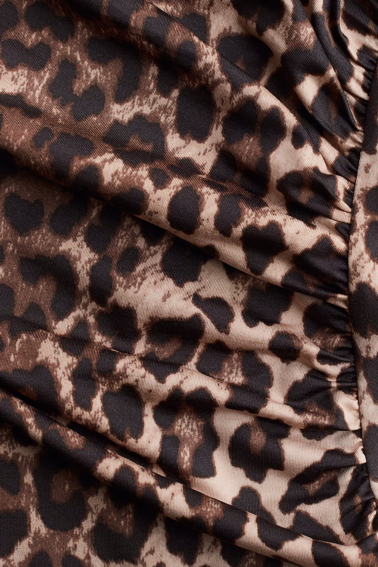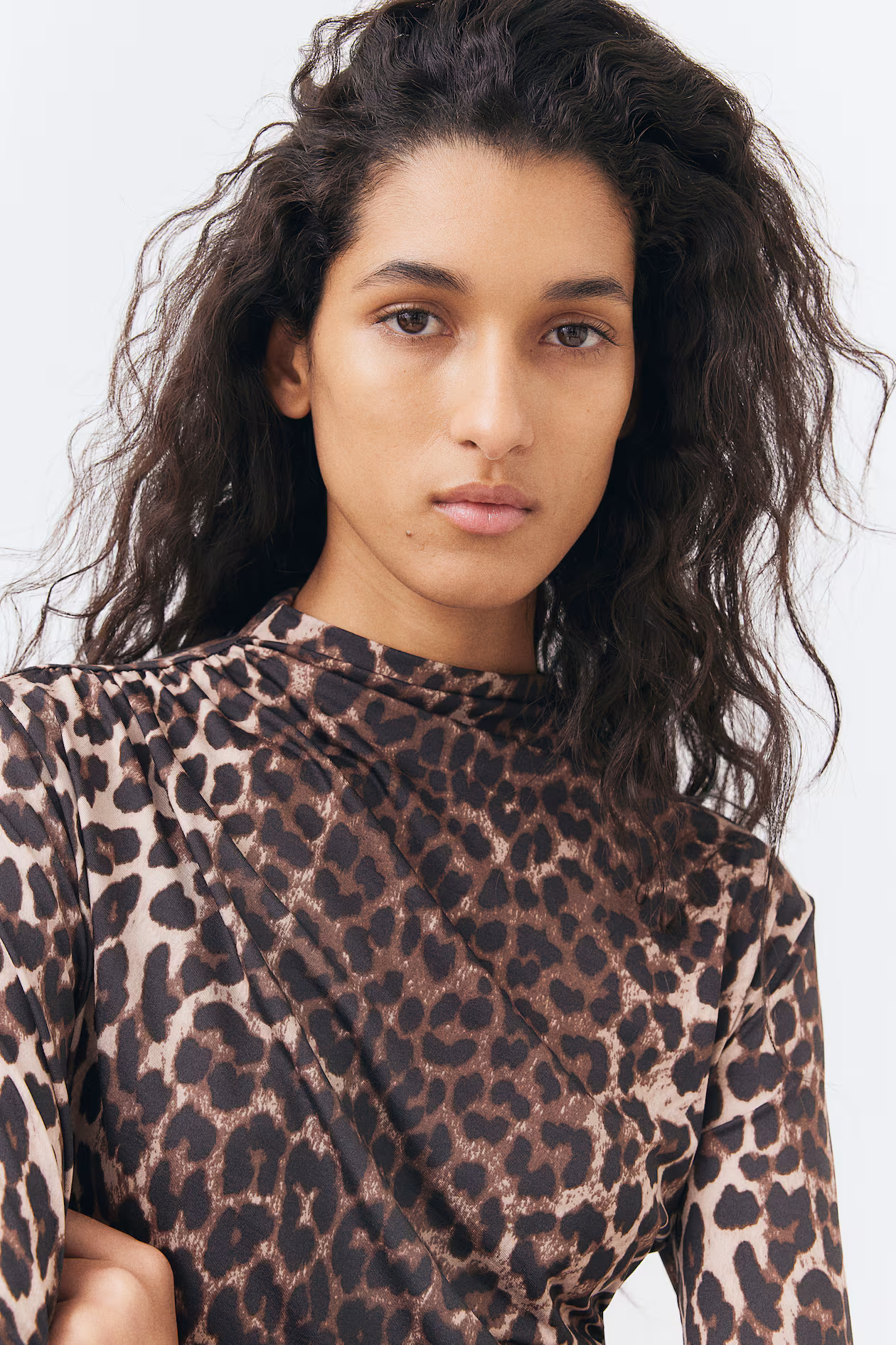Short, fitted dress in stretch jersey. Mock turtleneck, gathers on one shoulder, and a gathered, curved seam at opposite side of waist for a gently draped effect. Long sleeves.